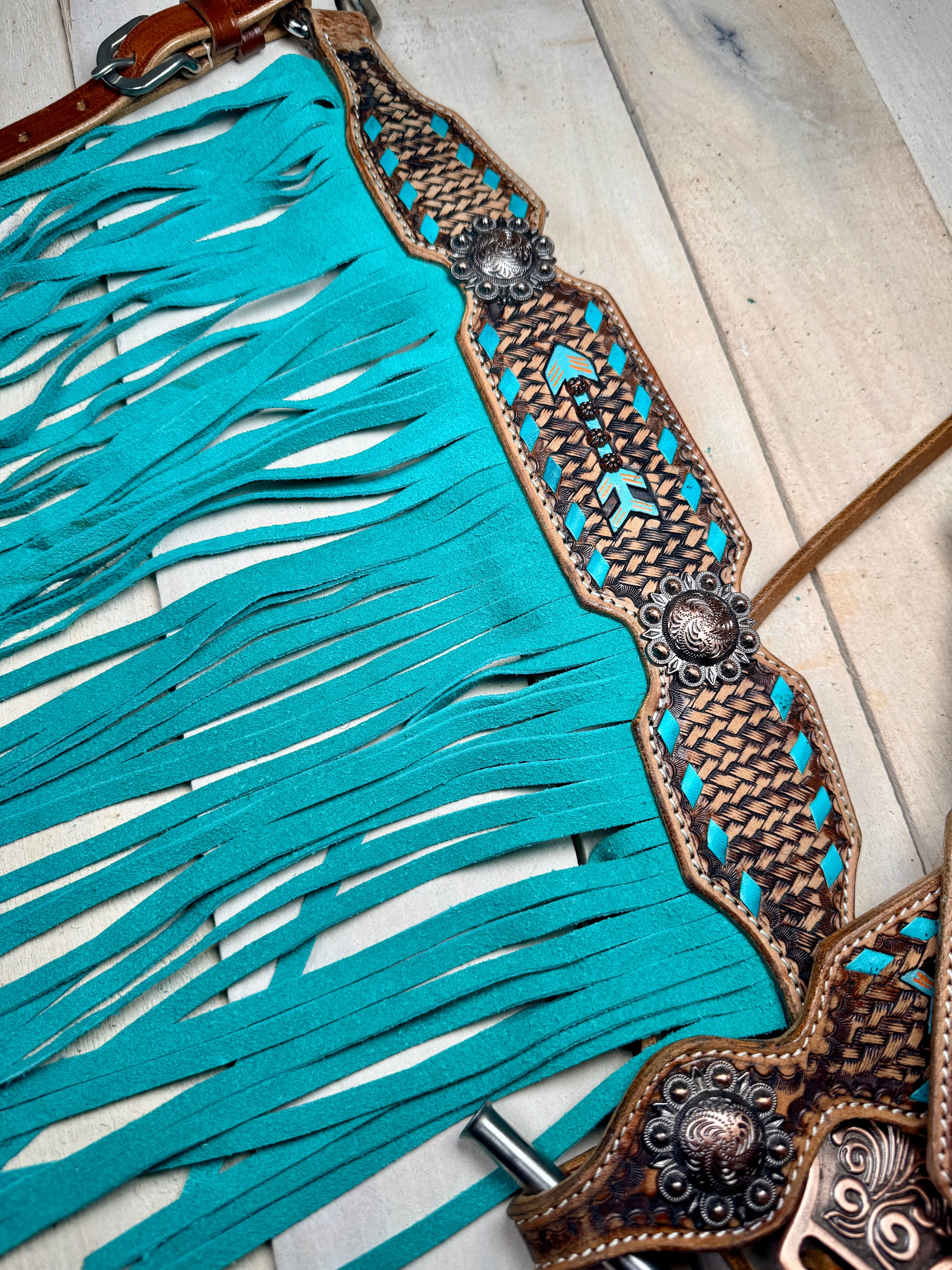 The hand-painted teal arrow design flows throughout the set, paired perfectly with teal rawhide lacing for a vibrant pop of color. The matching breast collar is finished with teal fringe for added movement and eye-catching flair, while copper conchos bring a warm, rustic accent to complete the look.