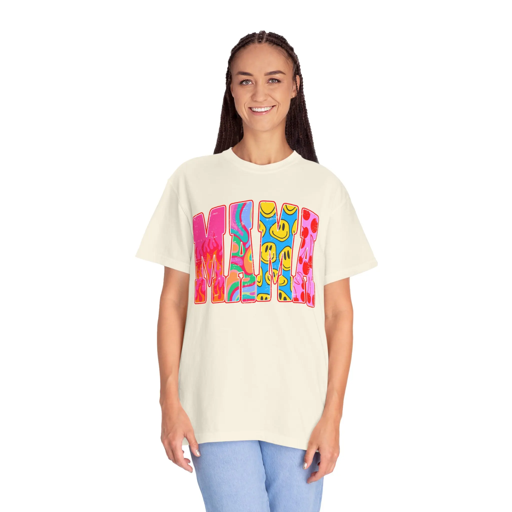 This heavyweight, garment-dyed tee brings sunny, playful energy to everyday wear. The relaxed fit and soft, post-dye texture feel lived-in from the first wear, while the bold, colorful front graphic injects a cheerful, retro-pop vibe into your rotation. Wear it to brighten a slow weekend, to layer under an open shirt for a casual night out, or as your go-to when you want to feel nostalgic and upbeat. The sturdy construction — double-needle seams and tubular knit — means this tee will keep its shape and color wash after wash, becoming more personal with each wear.