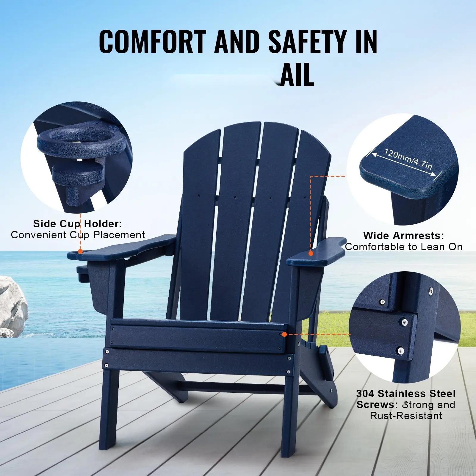 Our Adirondack chair features a foldable design for easy storage. Assembly is quick, taking only 15 minutes with a power screwdriver. Made from HDPE plastic, it supports up to 400 lbs and withstands sun, rain, and wind. Ideal for patios, gardens, and beaches.