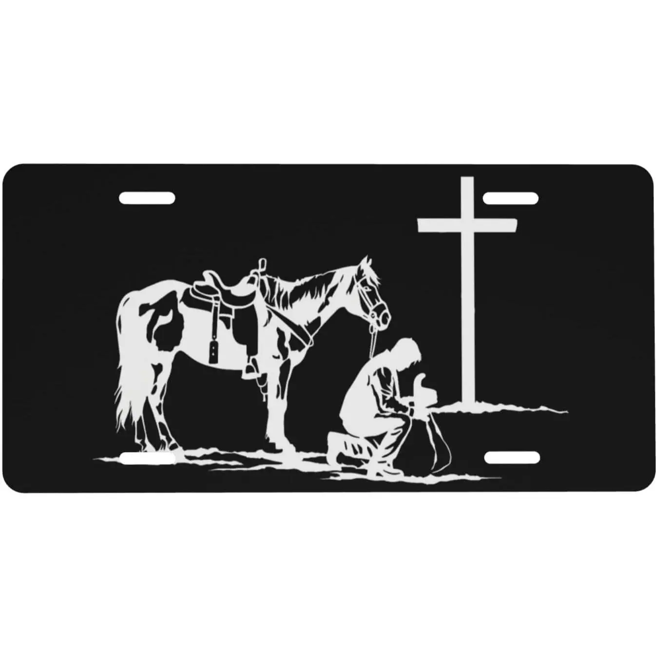 Cowboy horse cross praying front license plate 6x12.Christian western vanity tag for car truck suv.Religious gift with 4 holes.