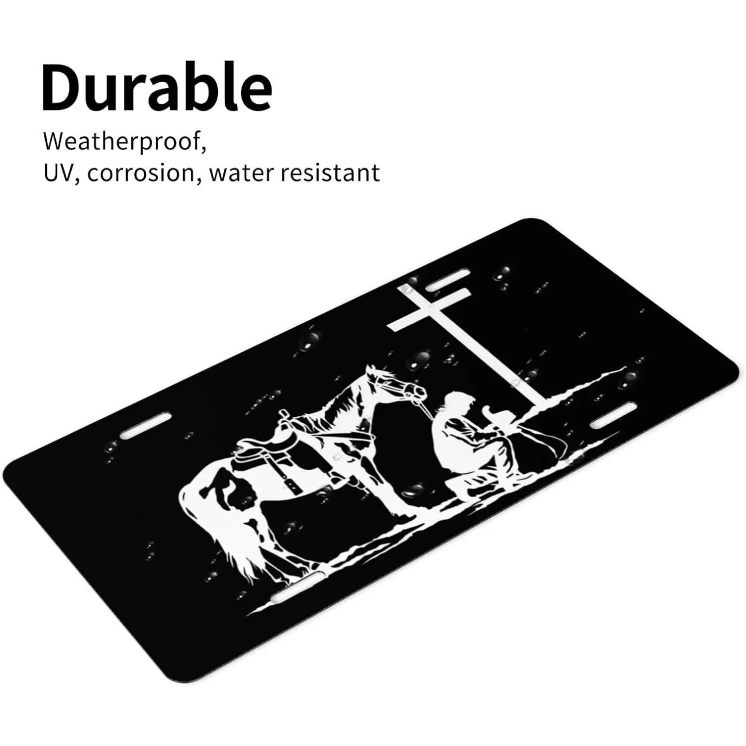 Ride in faith with thisCowboy Horse Cross Praying Front License Plate!Featuring a powerfulwestern design– a cowboy on horseback, paired with thecrossandpraying hands– symbolizing the deep faith of the country Christian.Whether you're a rancher, a horse lover, or simply a believer who loves the western way of life, this plate speaks to your soul.Made of durable aluminum, size 6x12 inches – fits most car, truck, and SUV front bumpers.