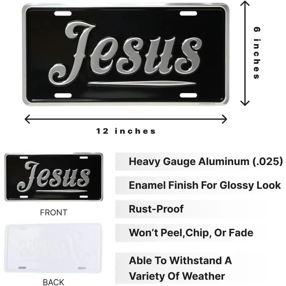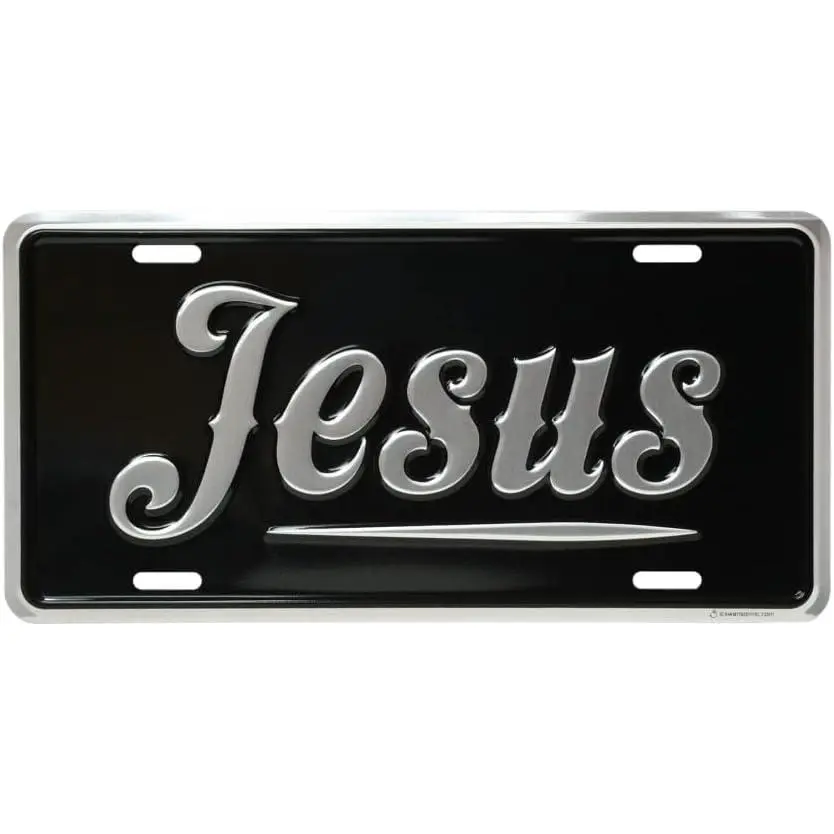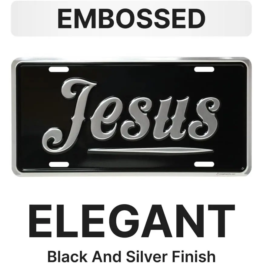 Jesus silver license plate 6x12.Inspirational embossed aluminum auto tag.Rust proof heavy gauge vanity plate for car truck suv.Made in USA.