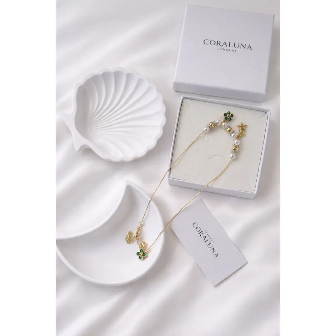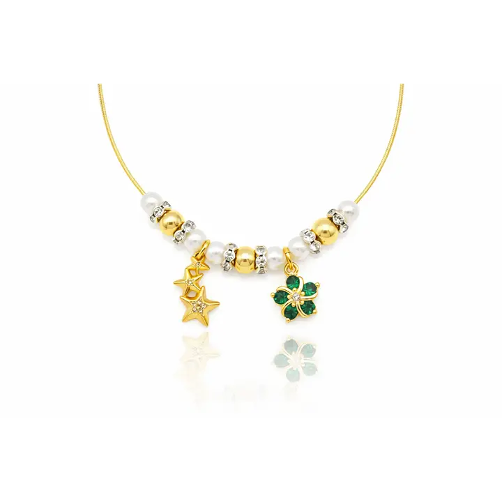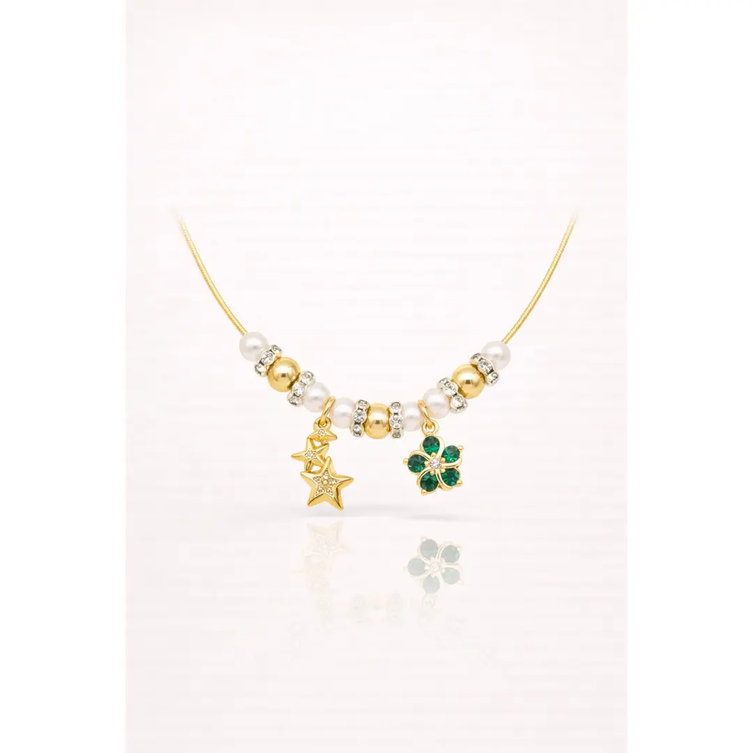 The Lucky Stars & Clover Pearl Necklace is an elegant piece of 18k gold filled jewelry designed to blend charm, sparkle, and timeless beauty. Featuring luminous pearls, polished gold-filled beads, and crystal-accented spacers, this necklace is finished with two symbolic charms: a trio of star charms representing hope and dreams, and a clover charm with rich green stones symbolizing luck and positivity.
