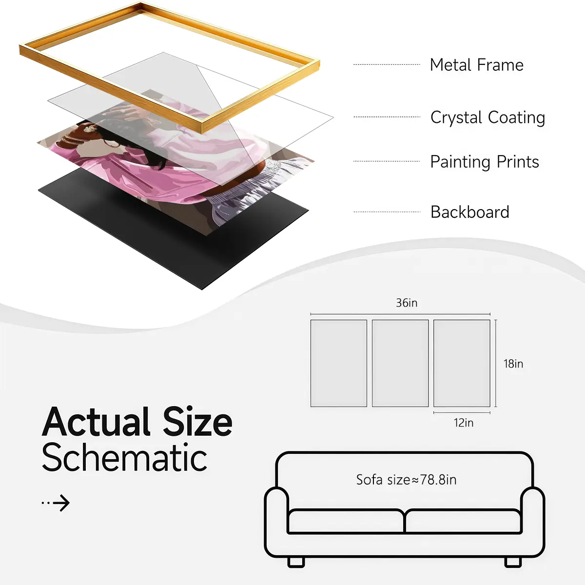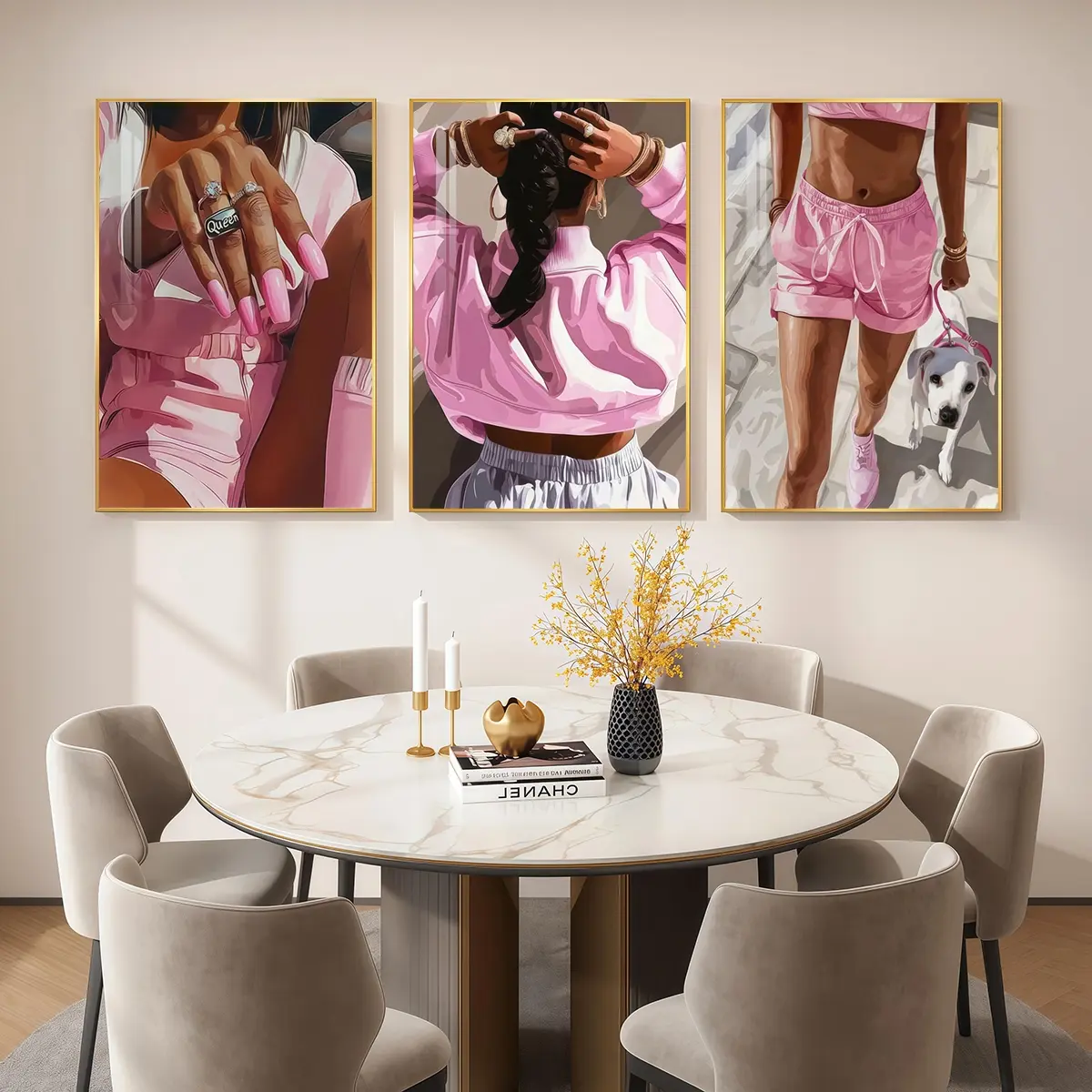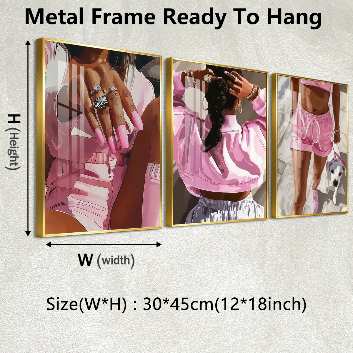 3 Counts Aluminum Alloy Framed Painting, Pink Fashion Woman With Dog And Jewelry Pictures, Home Decoration For Living Room, Bedroom, Office, Restaurant, Hallway Wall Decor, Odorless Print Artwork, Luxury Perfect Gift For Friends And Family