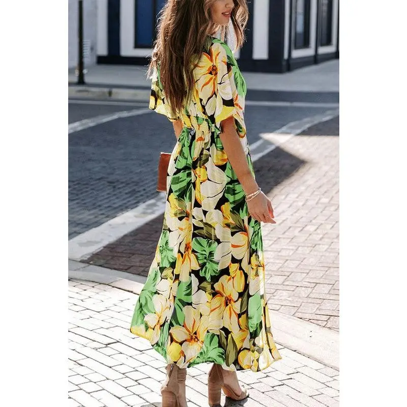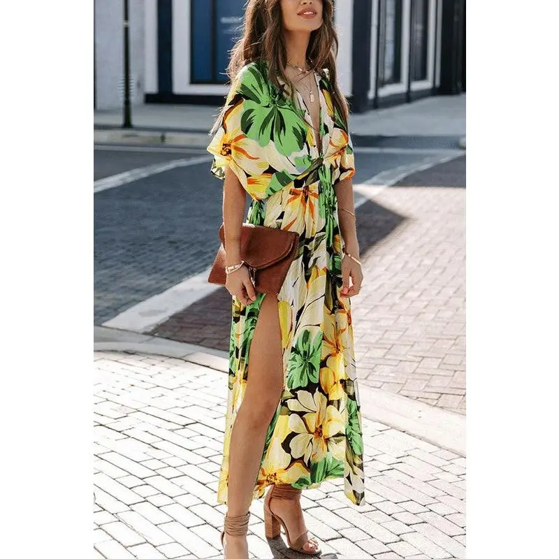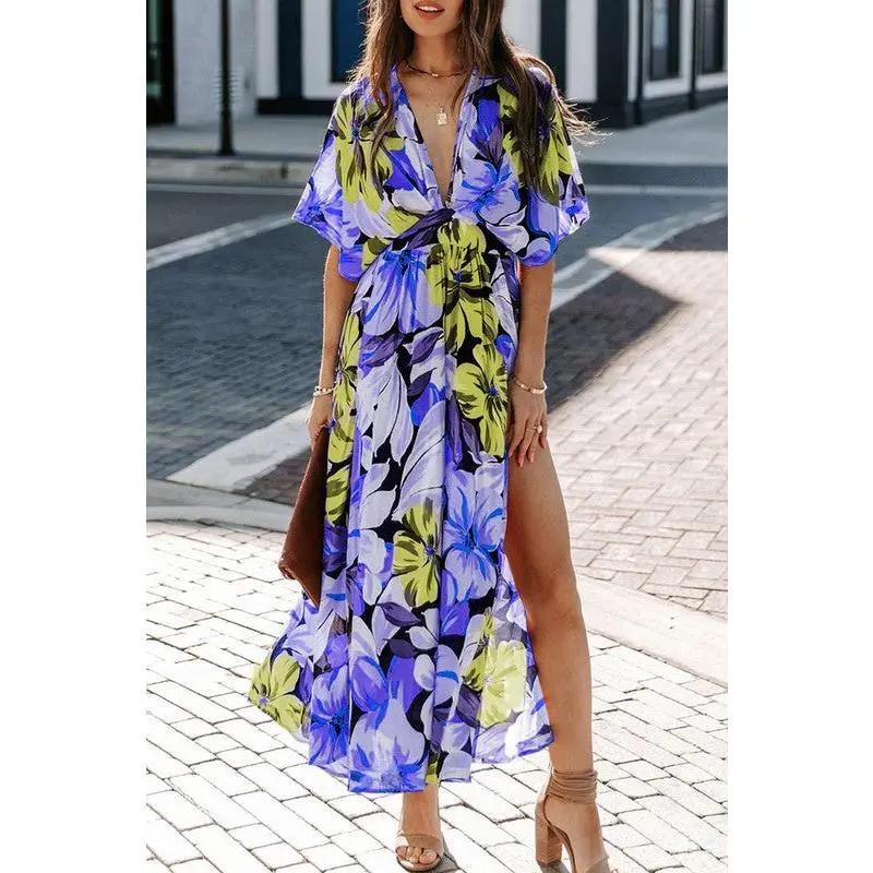Features: Maxi Dress For Women Features Sexy Wrap V Neck, Short Sleeve, Relaxed Fit, High Waist, Allover Floral, Polk Dot Print, Full Length Long Maxi Dress , Asymmetric Ruffle Trim At The Bottom, High Split At One Side, Wrap Belt At The Waist