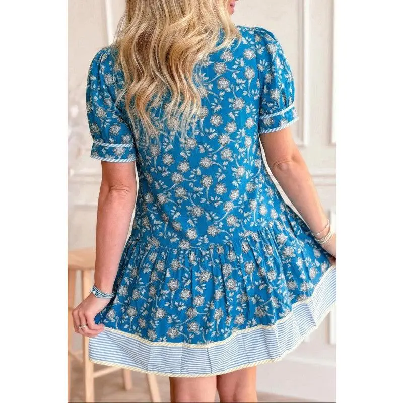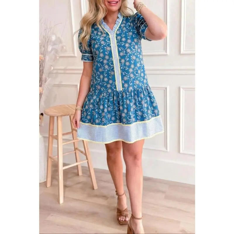 Bloom into summer style with this charming dress! Vibrant florals pop against crisp striped trim for a fresh, eye-catching look. The half button front keeps things casual and breezy, perfect for those days when you want easy, effortless dressing. Short sleeves keep you cool while the relaxed silhouette skims your frame beautifully, giving you room to move and groove. Whether you're heading to brunch or a garden party, this dress brings playful personality and comfort together in one delightful package. 100% Cotton