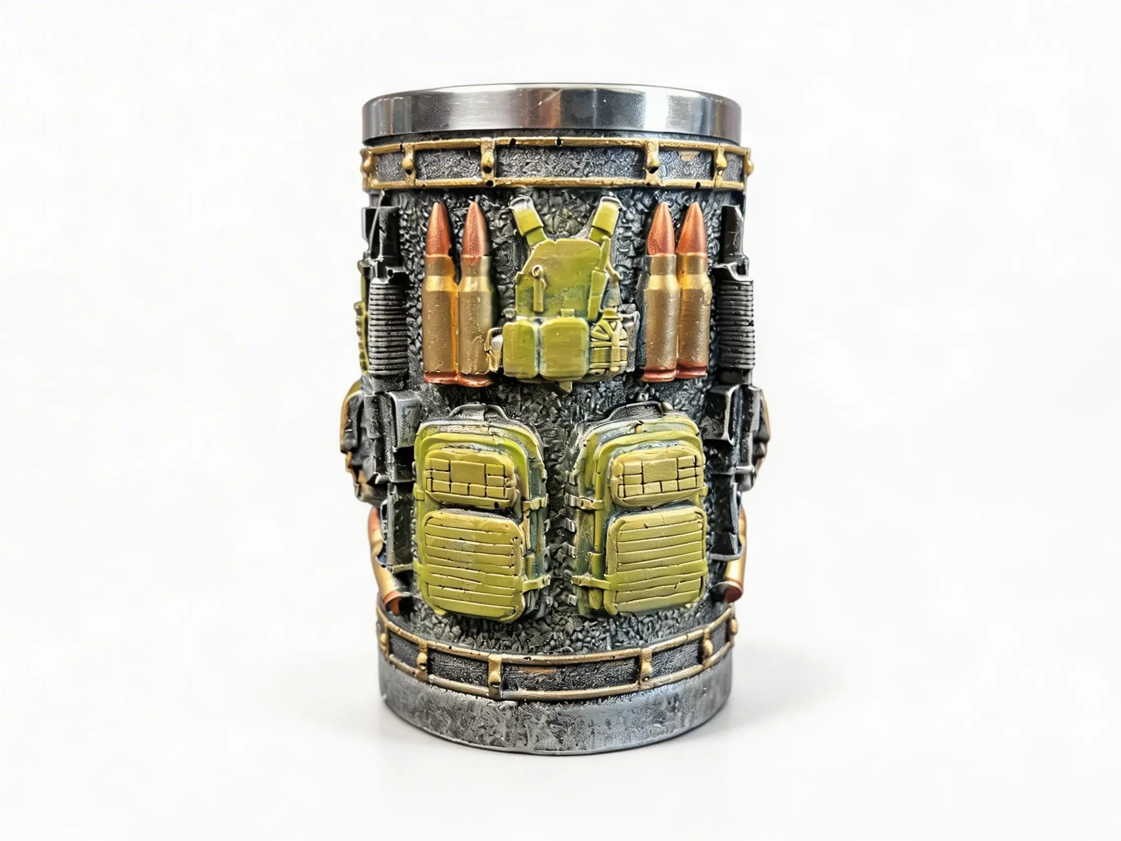 This isn’t just a regular coffee mug — it’s a fully sculpted 3D tactical gear masterpiece, packed with hyper-realistic details: bullet casings, tactical vests, rifles, grenades, and authentic US Army insignia, all finished with a rugged, battle-ready texture.
