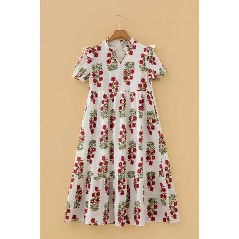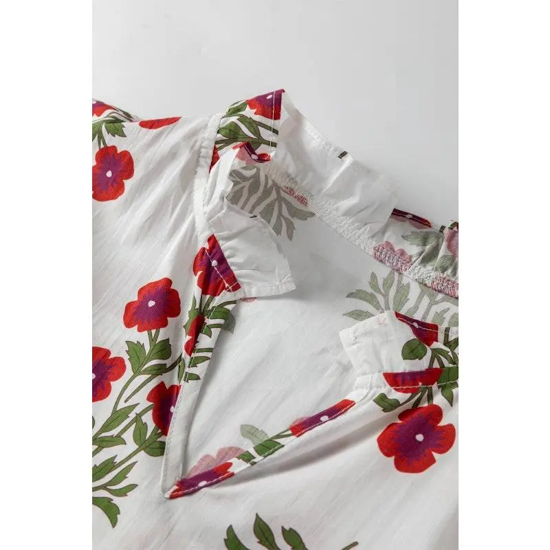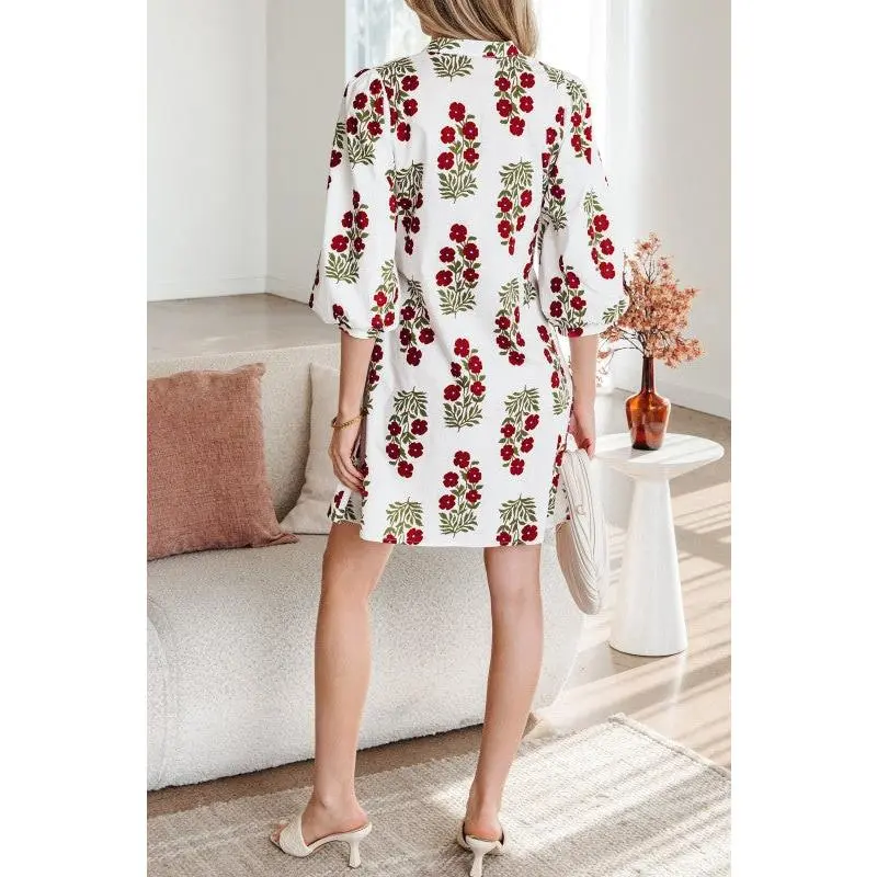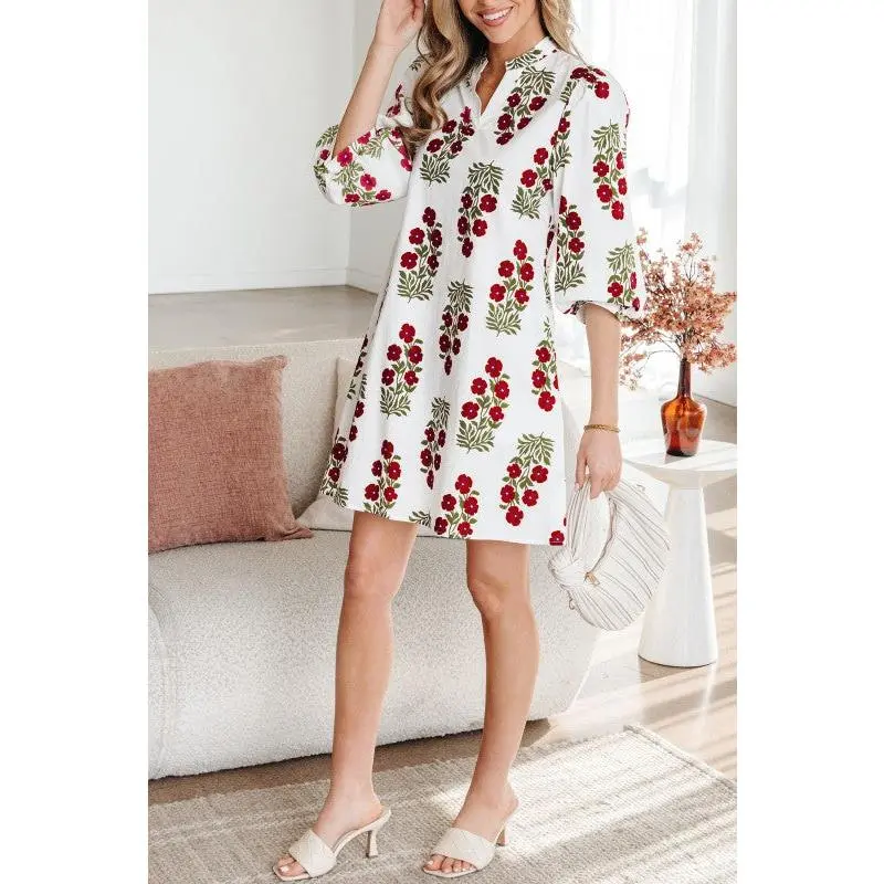 Bring a pop of color to your everyday style with this delightful floral mini dress! Featuring a flattering V-neckline and charming puffy 3/4 sleeves, it's the perfect piece for casual outings and warm-weather adventures. The relaxed, loose fit keeps you comfy all day long, while the delicate floral print adds instant personality to any look. Crafted from soft, breathable 100% cotton, this dress is your go-to for effortless style that feels as good as it looks. 100% Cotton
