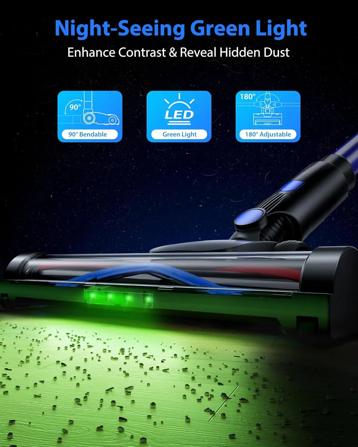 ·𝐒𝐜𝐢𝐞𝐧𝐭𝐢𝐟𝐢𝐜 𝐆𝐫𝐞𝐞𝐧 𝐋𝐢𝐠𝐡𝐭 𝐟𝐨𝐫 𝐂𝐥𝐞𝐚𝐫𝐞𝐫 𝐂𝐥𝐞𝐚𝐧𝐢𝐧𝐠 - The floor brush's 520nm green LED exposes hidden dust while reducing glare. Its adjustable head reaches tight spaces, eliminating furniture-moving hassles.