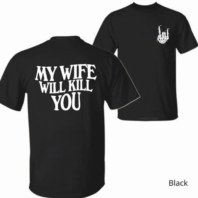 My Wife Will Kill You Funny Skeleton Hand Double Sided T-Shirt, Halloween Gift for Husband, Matching Couple Tee