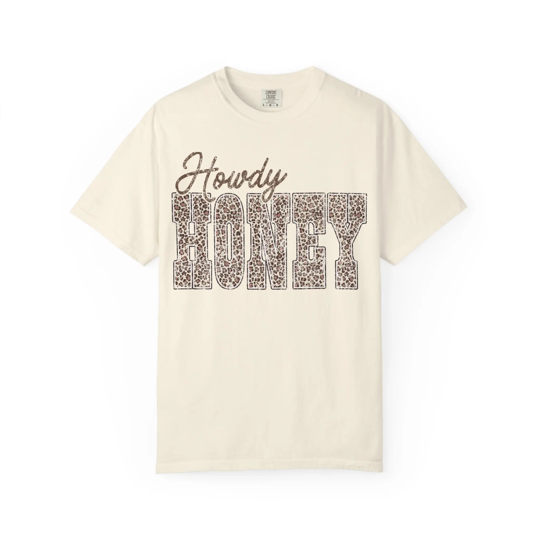 This relaxed, garment-dyed tee brings a warm, playful energy to everyday wear. The soft, heavyweight cotton feels substantial yet broken-in from the first wear thanks to the post-construction dyeing and ring-spun yarn. The front graphic—“Howdy” in a friendly script above bold, leopard-print block letters spelling “HONEY”—gives the shirt a country-chic attitude that’s equal parts flirty and confident. It layers easily under a denim jacket or stands alone with high-waist jeans and boots for a casual weekend look. Durable double-needle stitching and a tubular, seam-free body mean the silhouette keeps its shape while staying comfortable through repeated wear. Offered in an array of colors and sizes, this tee is made to be lived in and loved by those who like a little Southern sass in their wardrobe.