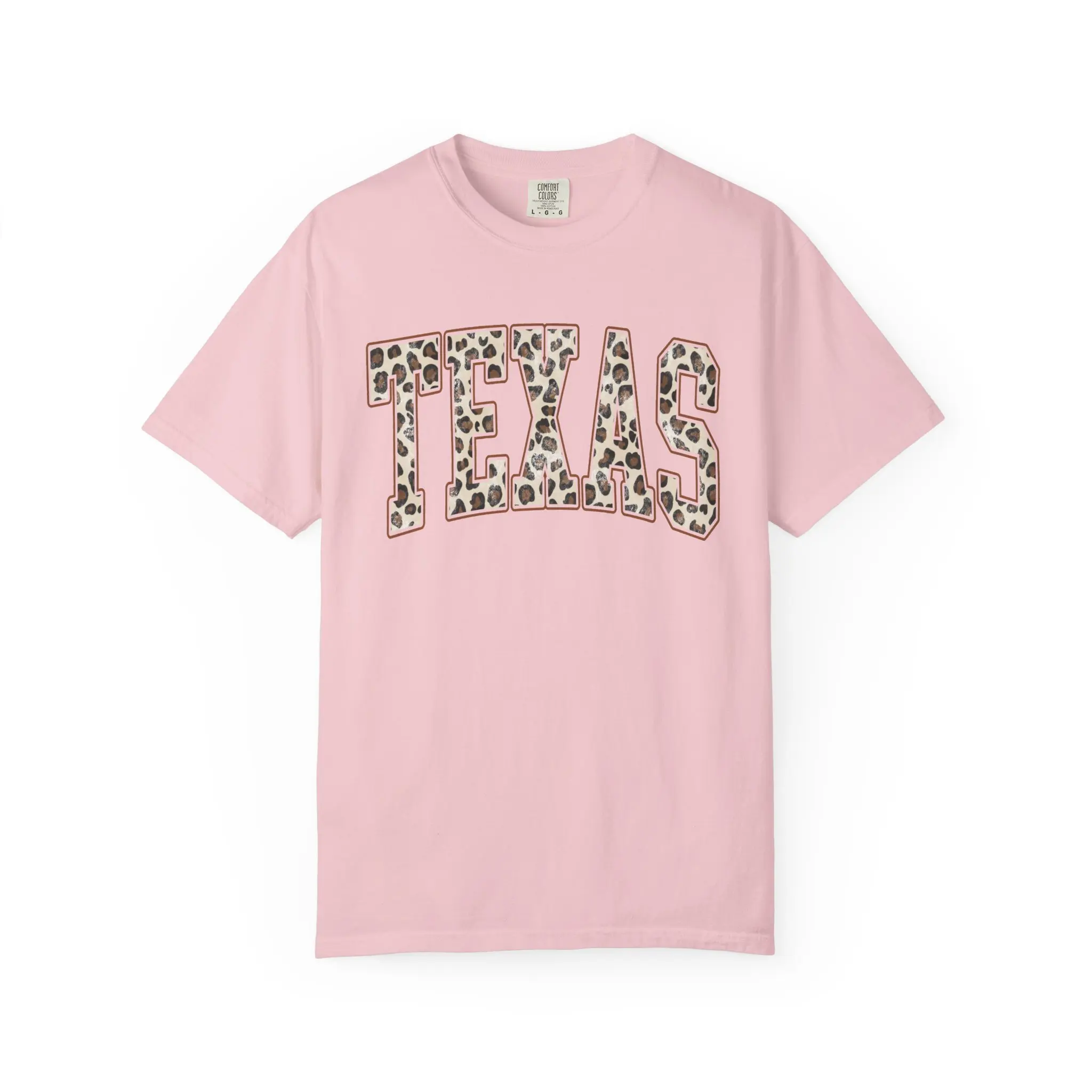 Soft, heavy-weight cotton meets playful southern spirit. This garment-dyed tee feels broken-in from the first wear, with a plush hand and relaxed fit that settles like an easy afternoon. The front sports a bold "TEXAS" varsity-style arc filled with a subtle leopard print—an unexpected nod to wild charm and home-state pride. Wear it to town runs, weekend coffee dates, or layered under a denim jacket for an effortless, lived-in look.