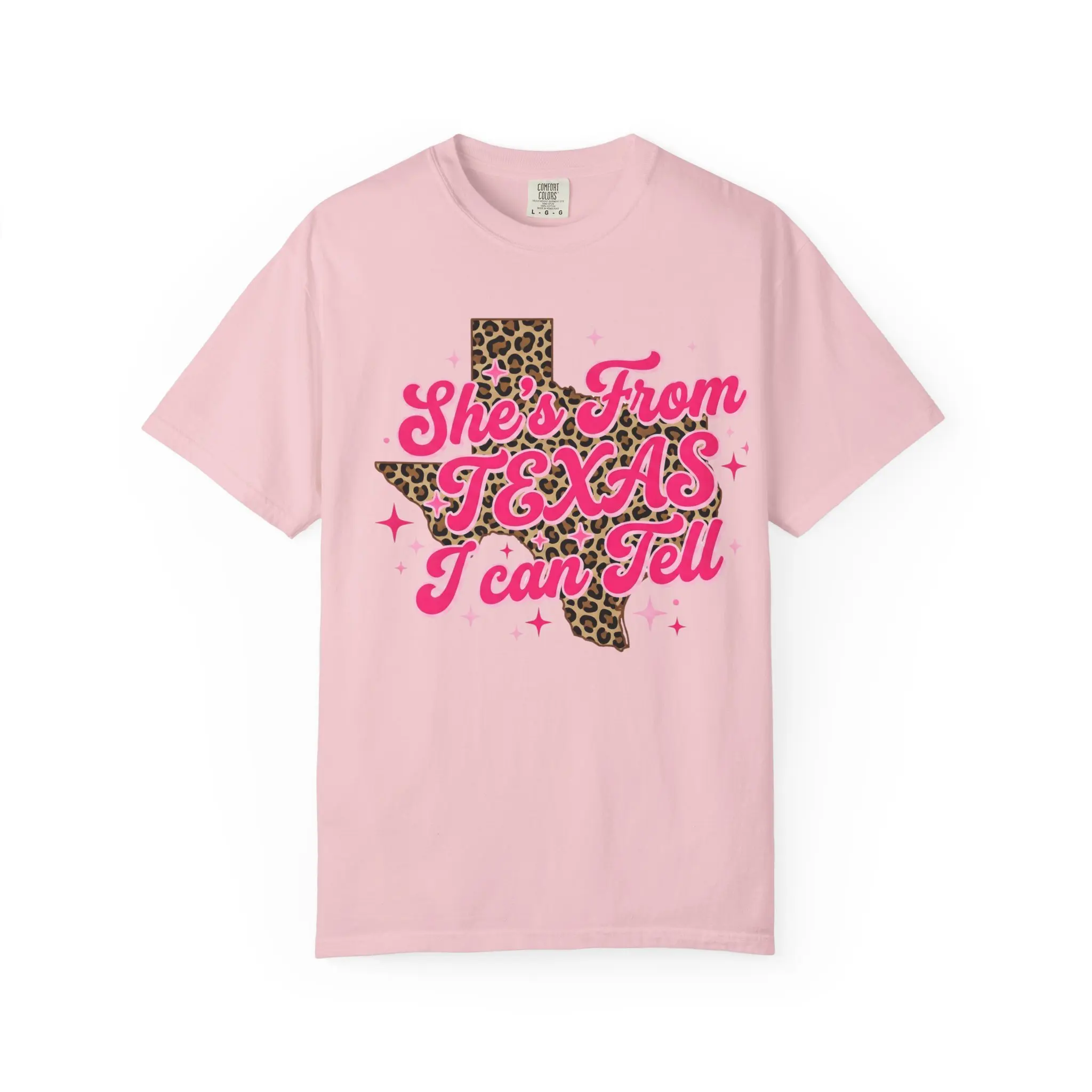 This garment-dyed tee brings warm, worn-in comfort and bold Texas pride together. The relaxed, heavyweight cotton feels substantial yet soft, with a faded, lived-in color that highlights the leopard-print Texas silhouette and vibrant pink script. It slips easily into everyday life — layered under a denim jacket for market mornings, paired with boots for a roadside diner, or worn at backyard gatherings where stories get louder and laughter lasts. The look reads playful and confident, for someone who loves state pride with a little glam. Durable construction and a roomy cut keep it comfortable through long drives, late-night bonfires, and weekends of exploring small-town shops.