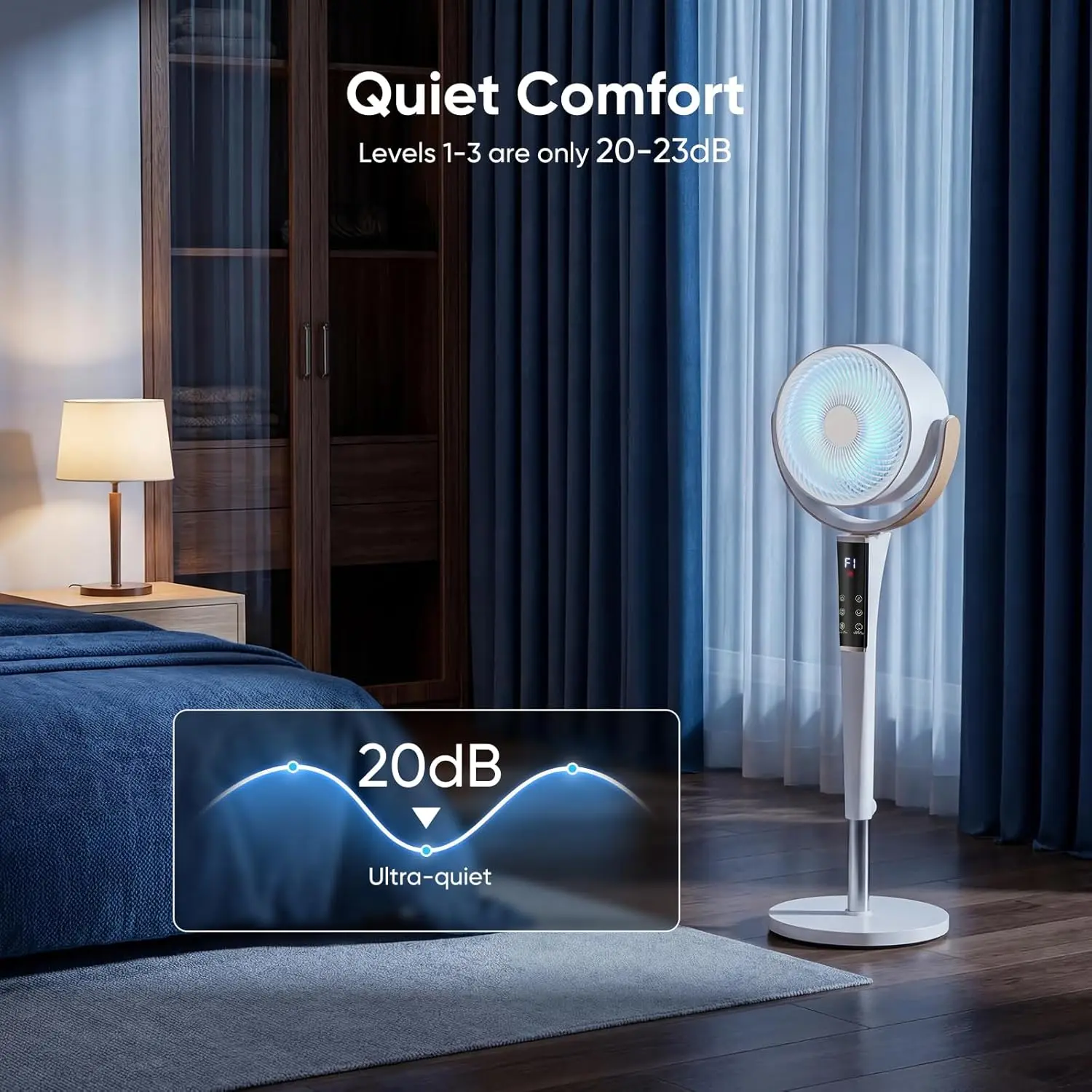 Operates at a low noise level of 20-23 dB on lower speeds. Sleep mode and the 1-12 hour smart timer allow for automatic adjustments, helping create a quiet environment for rest.