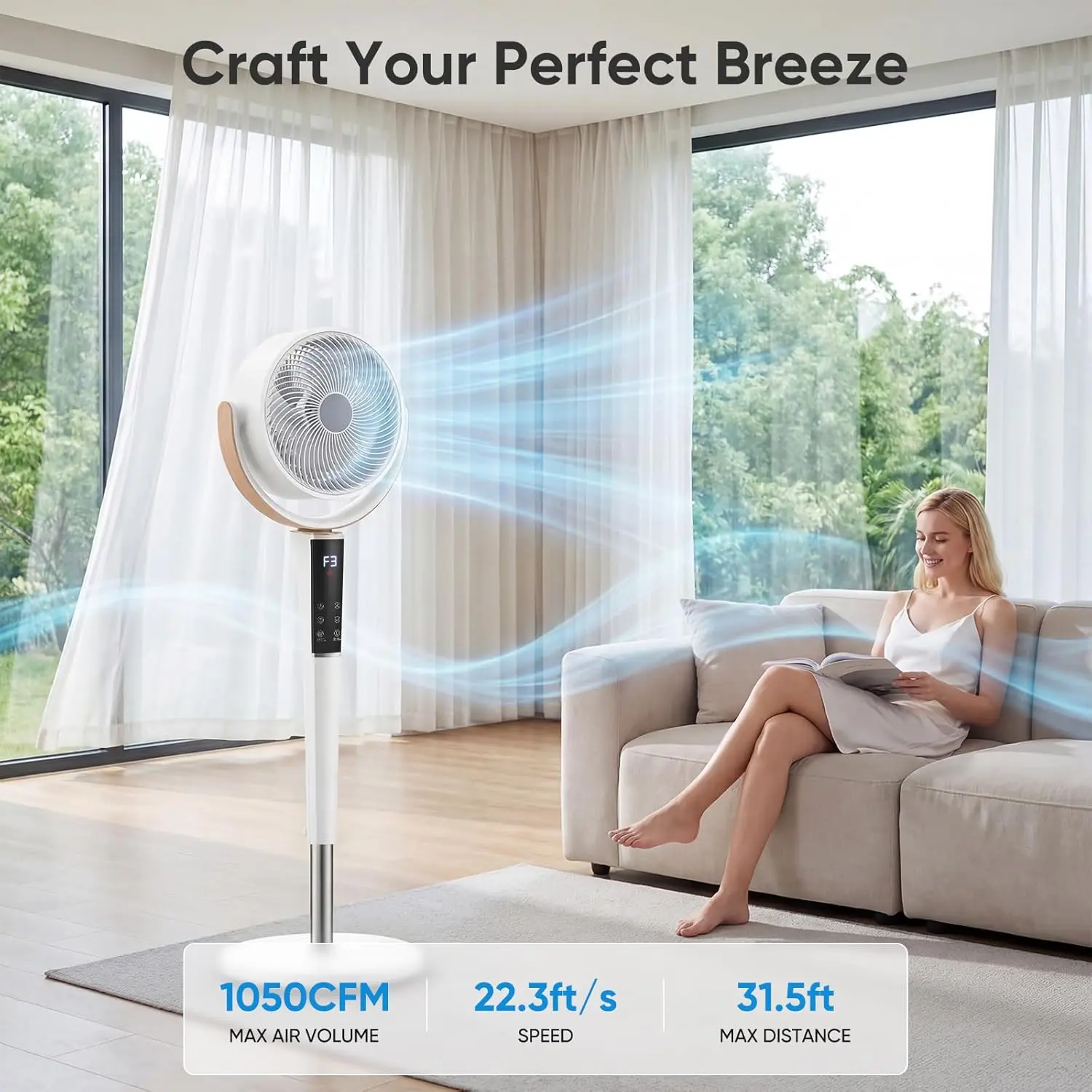 Delivers 1050 CFM of airflow with a brushless DC motor and 220mm blades. Designed to circulate fresh air throughout the room, suitable for bedrooms, living rooms, or offices.