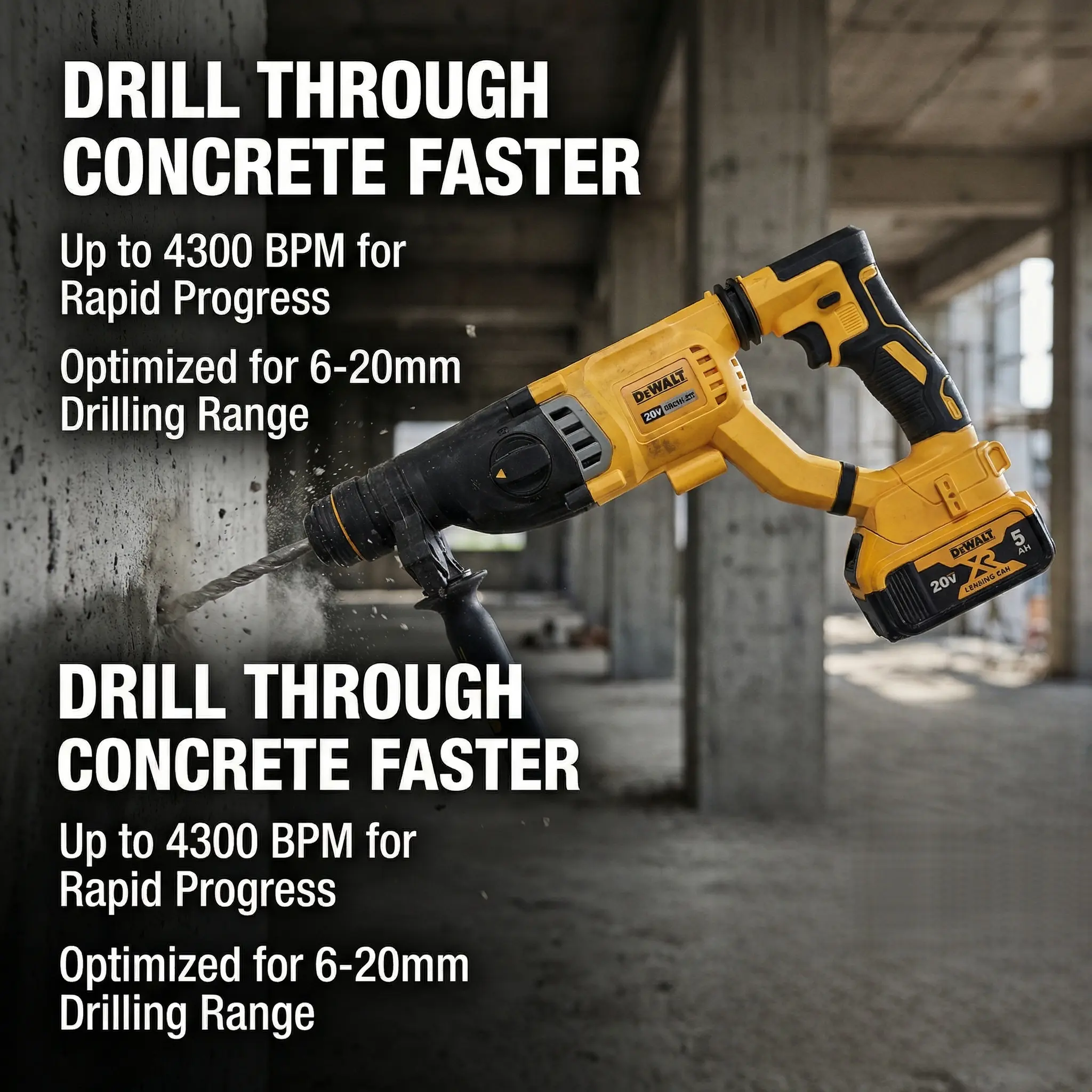 Dewalt DCH263 is a 20V brushless rotary hammer built for bigger concrete jobs. More impact, less weight, and no cord holding you back.