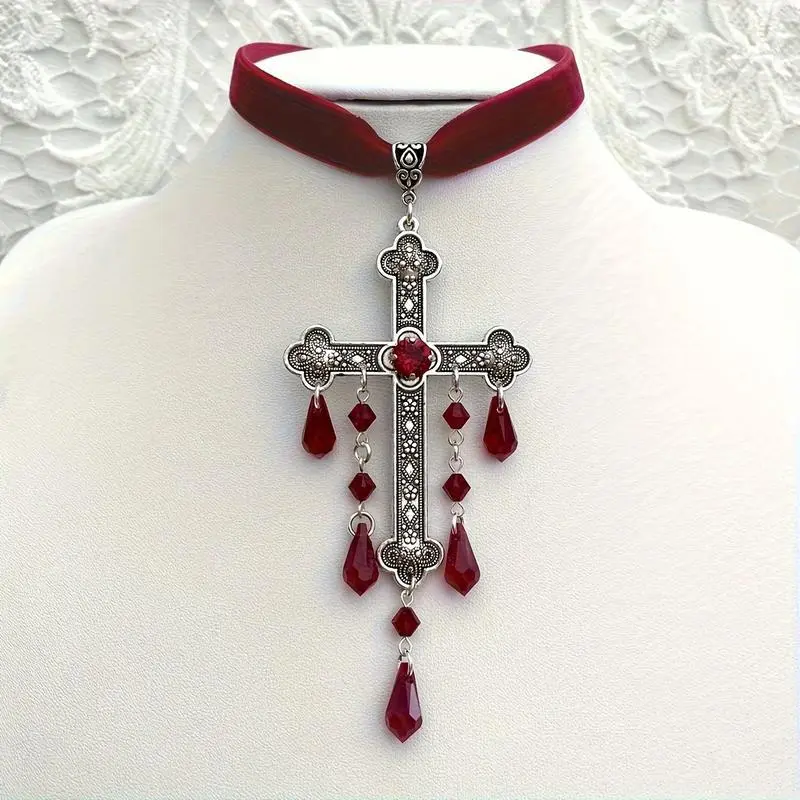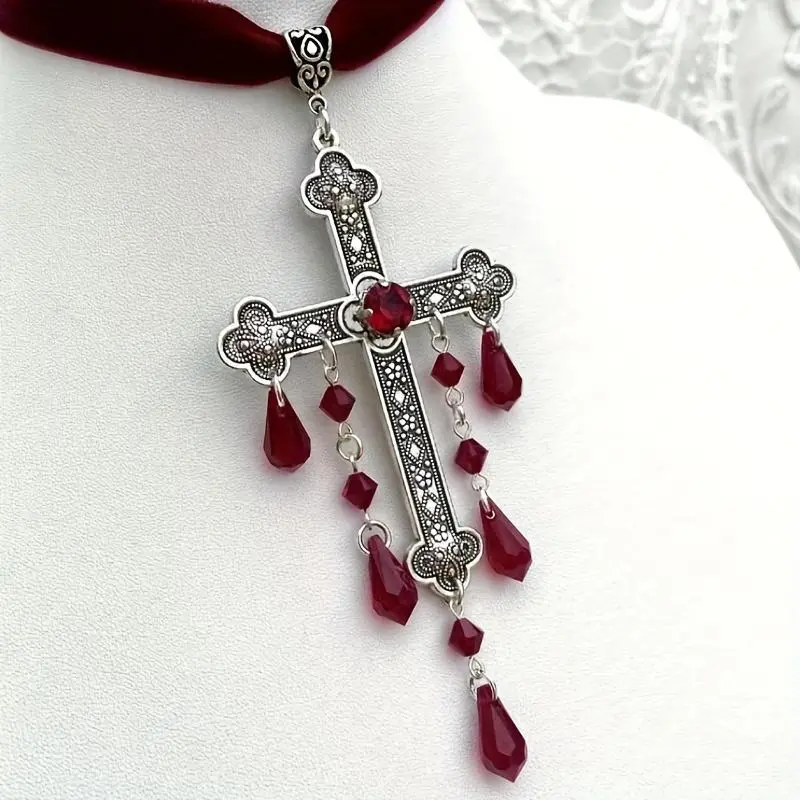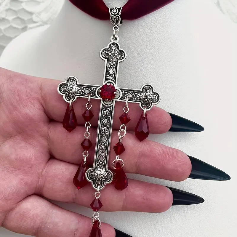 SilveryGothicVampireCruciformNecklace,VintageBohemianStyleSyntheticGemsDecor-3CustomScriptNameNecklaceBookPendantSterlingSilverSaintMichaelLargePearlSaturnWaterDropChokerclothstargallstoneHypoallergenicgrayfinger