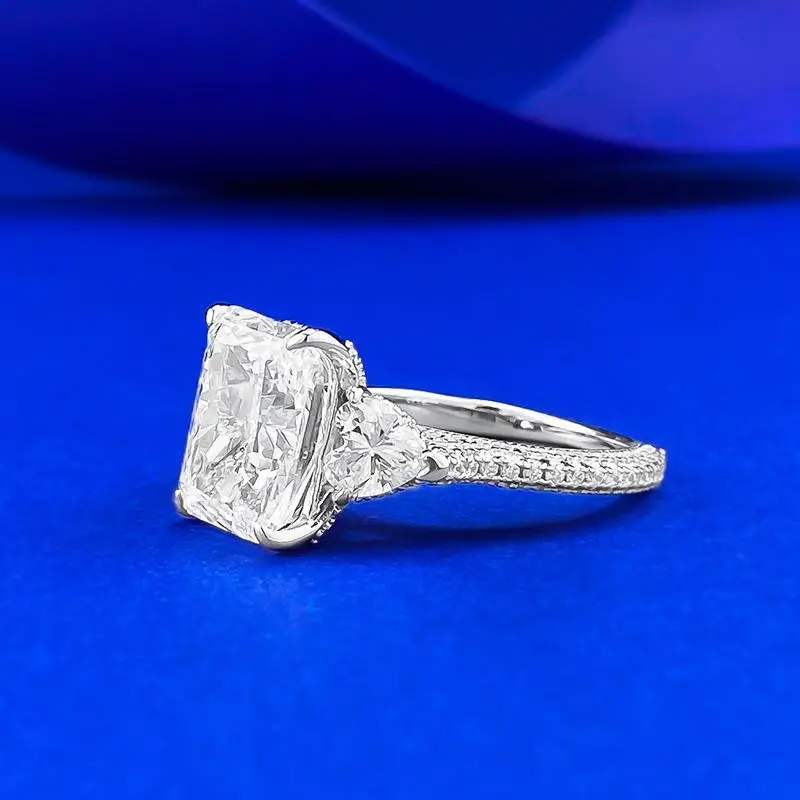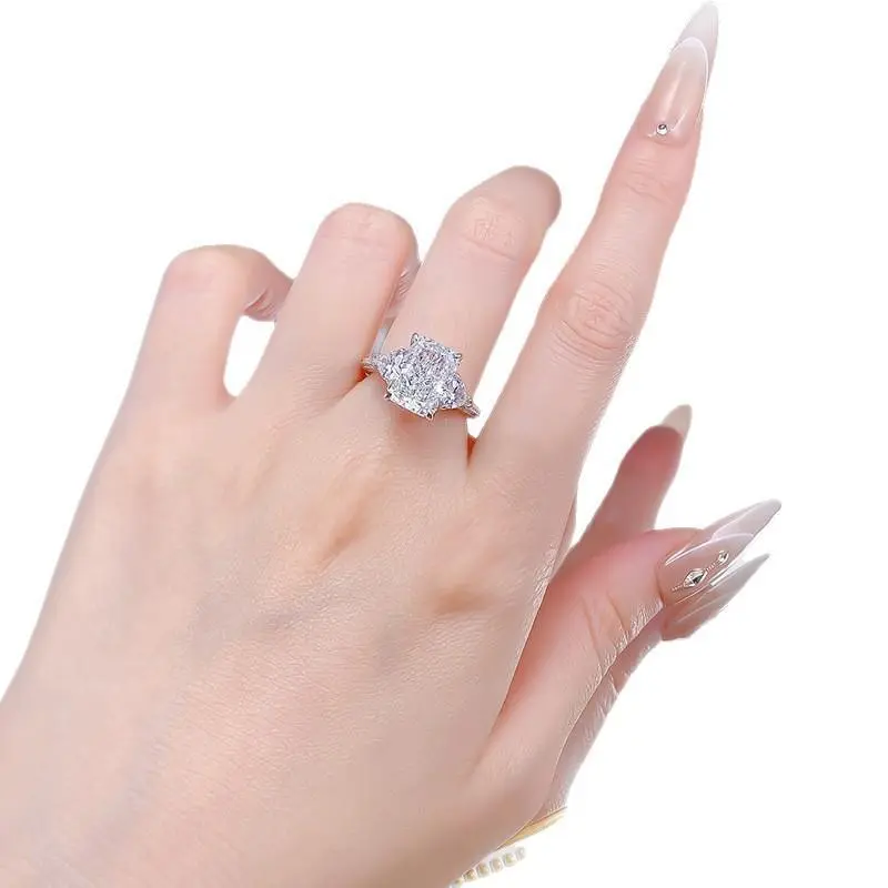 Material: S925 Sterling Silver/ 8A Cubic Zirconia Main Stone type: 8*11mm Ring Size: 5/6/7/8/9 Introducing our stunning S925 Sterling Silver Ice Flower Cut Rectangular Three Stones Ring featuring an 8*11mm 8A Cubic Zirconia. Crafted with high-grade zircon, this ring is truly a showstopper. We use high-grade zircon in our jewelry, which sets us apart from other low-grade zircon options on the market. The high-grade zircon we use has higher dispersion, resulting in a stronger refractive index and a more brilliant shine. Additionally, high-grade zircon has a higher density, making it more solid and wear-resistant. The Ice Flower Cut Rectangular Three Stones design of this ring adds a touch of elegance and sophistication to any outfit. The 8A Cubic Zirconia stone sparkles with a great fire color, making it a standout piece in your jewelry collection. Whether you're dressing up for a special occasion or simply adding a touch of glamour to your everyday look, this ring is the perfect choice. Treat yourself or someone special to the luxury of high-grade zircon jewelry with our S925 Sterling Silver Ice Flower Cut Rectangular Three Stones Ring.