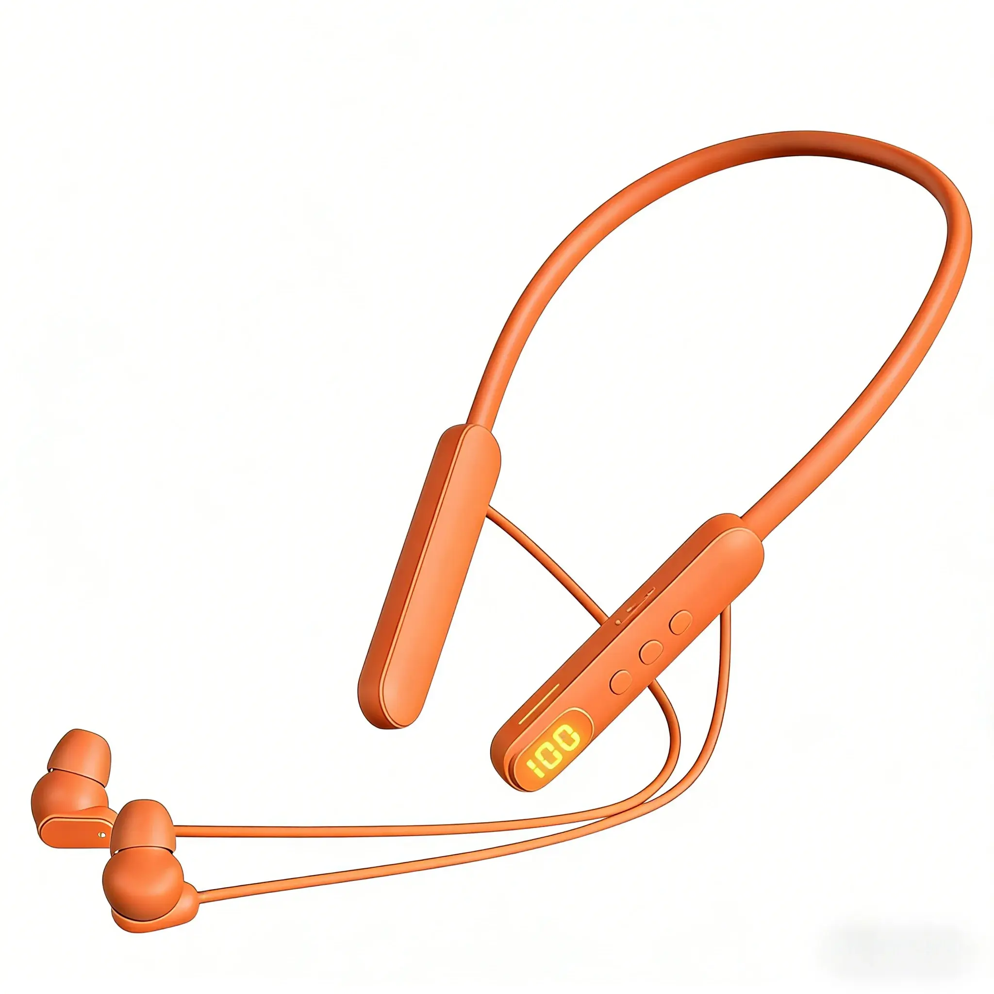 Upgrade your daily audio with these sleek orange neckband Bluetooth headphones.They’re lightweight and ergonomic, so you can wear them all day comfortably-great for commutes, gym sessions, or casual use.The built-in digital battery display lets you check power at a glance, so you won’t get unexpected shutdowns mid-use.Stable Bluetooth connectivity delivers clear, balanced sound for music, calls, and media.Snug earbuds reduce sound leakage and stay secure during movement.Durable construction ensures reliable performance for your daily routines.