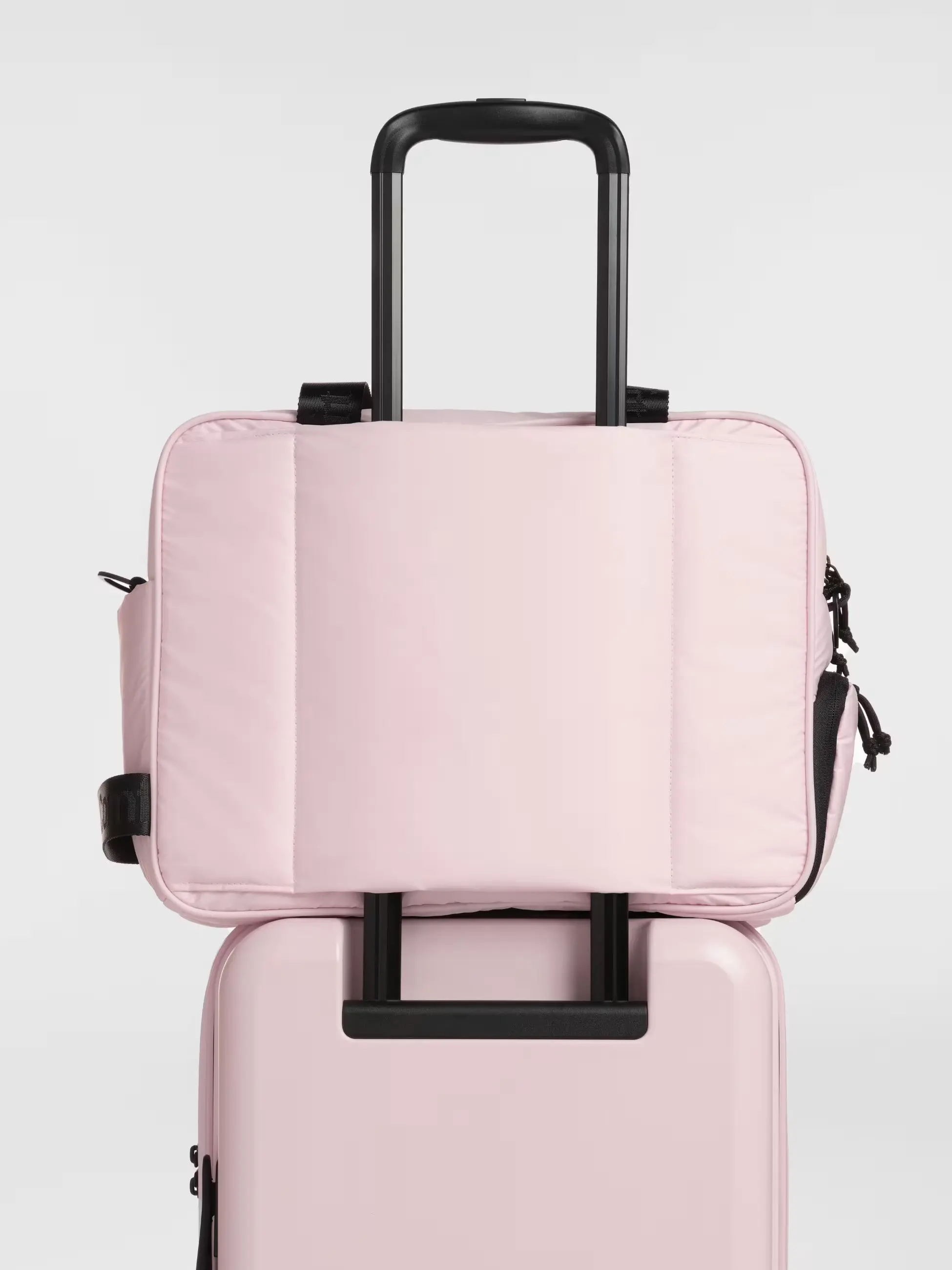 The laptop sleeve fits up to 15 inches so it pulls double duty as a work bag and laptop travel bag. The luggage sleeve slides right onto your suitcase handle making it the smoothest weekender bag you've ever traveled with, and the waterproof duffel bag construction means a little rain or a spilled coffee isn't a crisis.