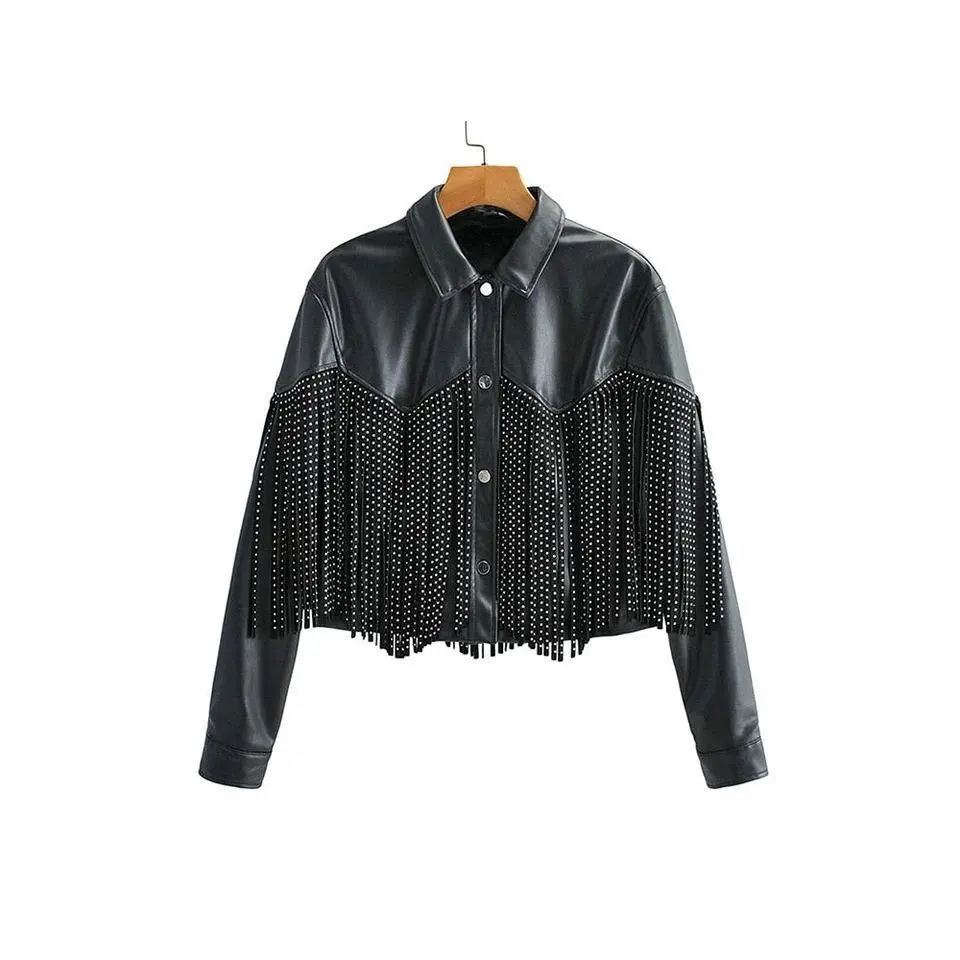 Women's Versatile Style for Comfort The Belinda Fringe Rhinestone Leather Jacket is a versatile piece for women. It features a front leather design with rhinestone embellishments, adding a touch of elegance. This jacket is perfect for those seeking a stylish yet comfortable outfit. Ideal for various occasions, it enhances your look * Front Leather Design: Ensures a sleek and modern appearance. * Rhinestone Embellishments: Adds a glamorous touch to the jacket. * Versatile Style: Suitable for different occasions and outfits. This leather jacket is a must-have for any woman's wardrobe. It combines style and comfort, making it a versatile choice for everyday wear. Perfect for layering or wearing alone, the Belinda jacket is a fashionable addition to