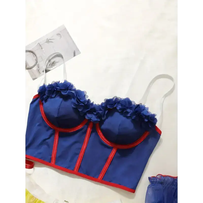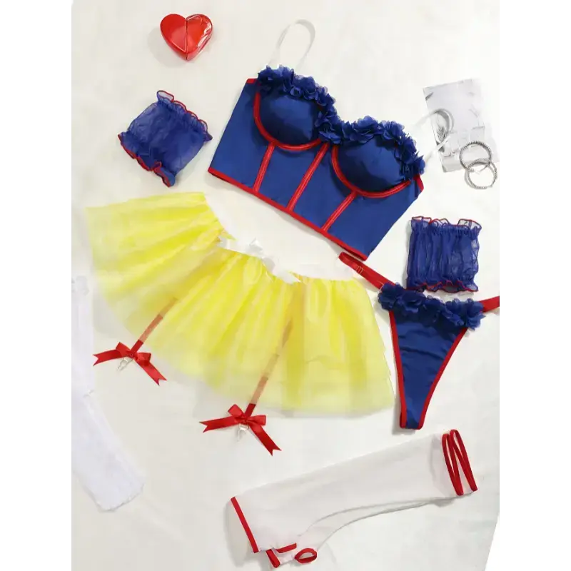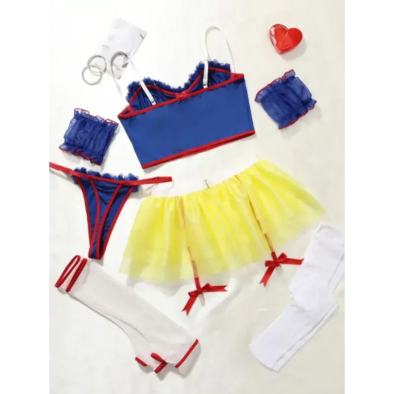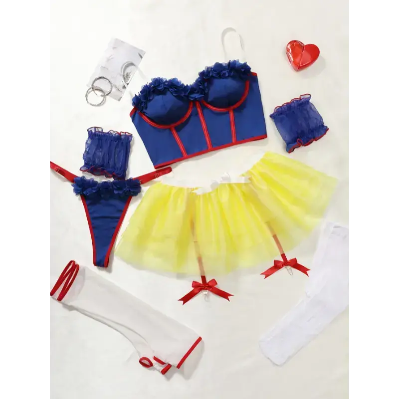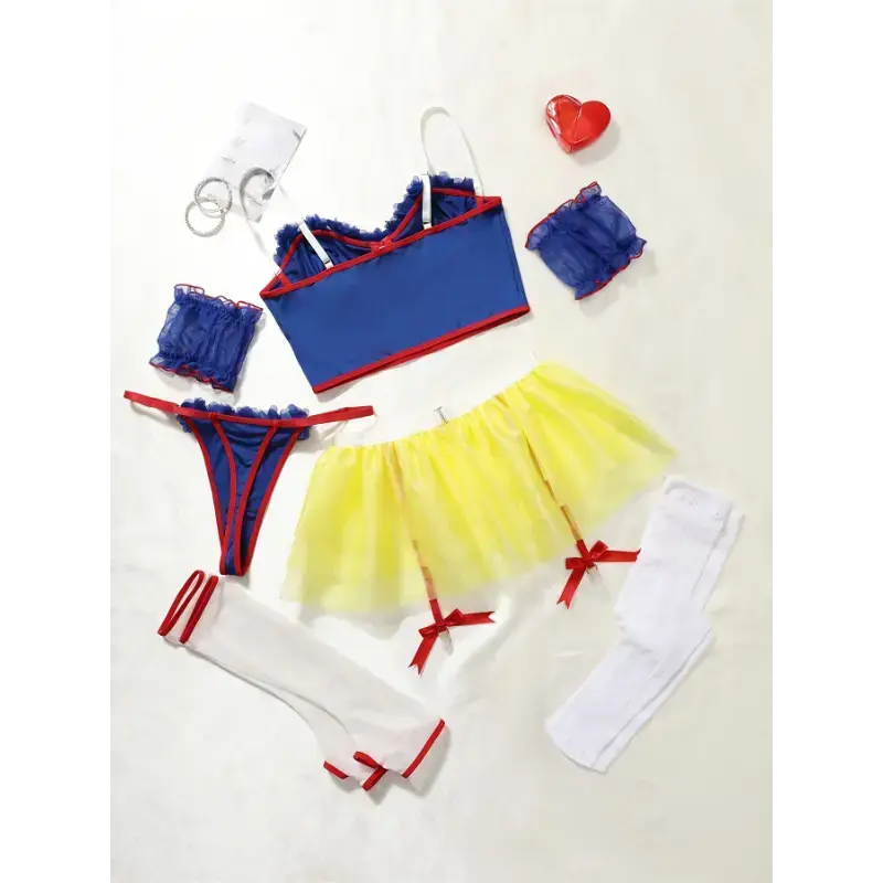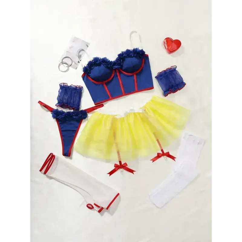 1set Sexy Women's Outfit Adult Role Playing Fairytale Princess Lingerie Set-Delicate Lace Trim Bra Skinny Underwire Top Flirty Short Skirt, Dainty Arm Ring-Halloween Romantic Set,Crop Top Arm Sleeves,Garter Belt And Panties,Puffy Skirt & Fabric Womenswear