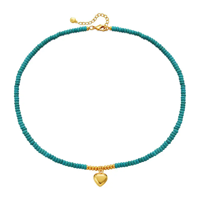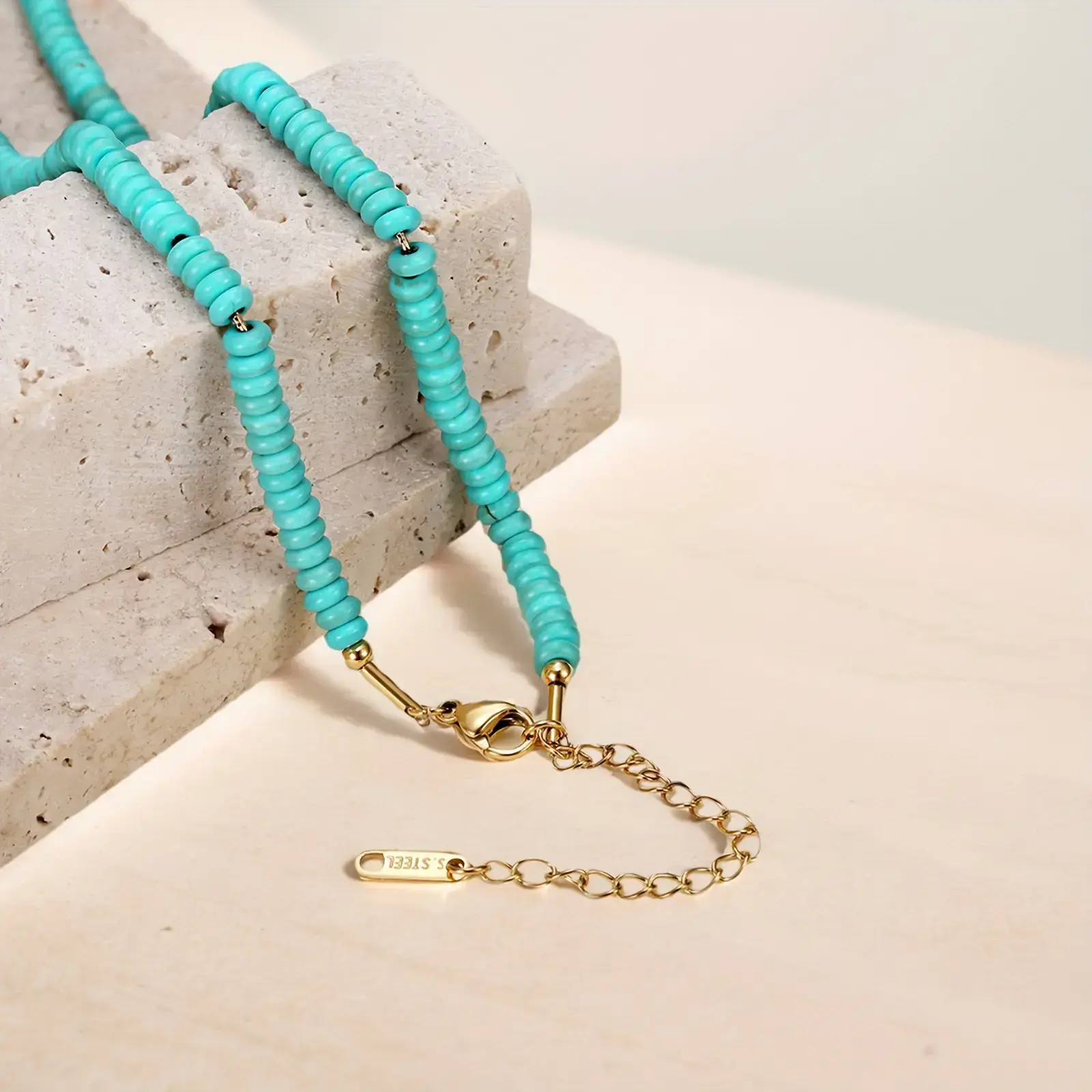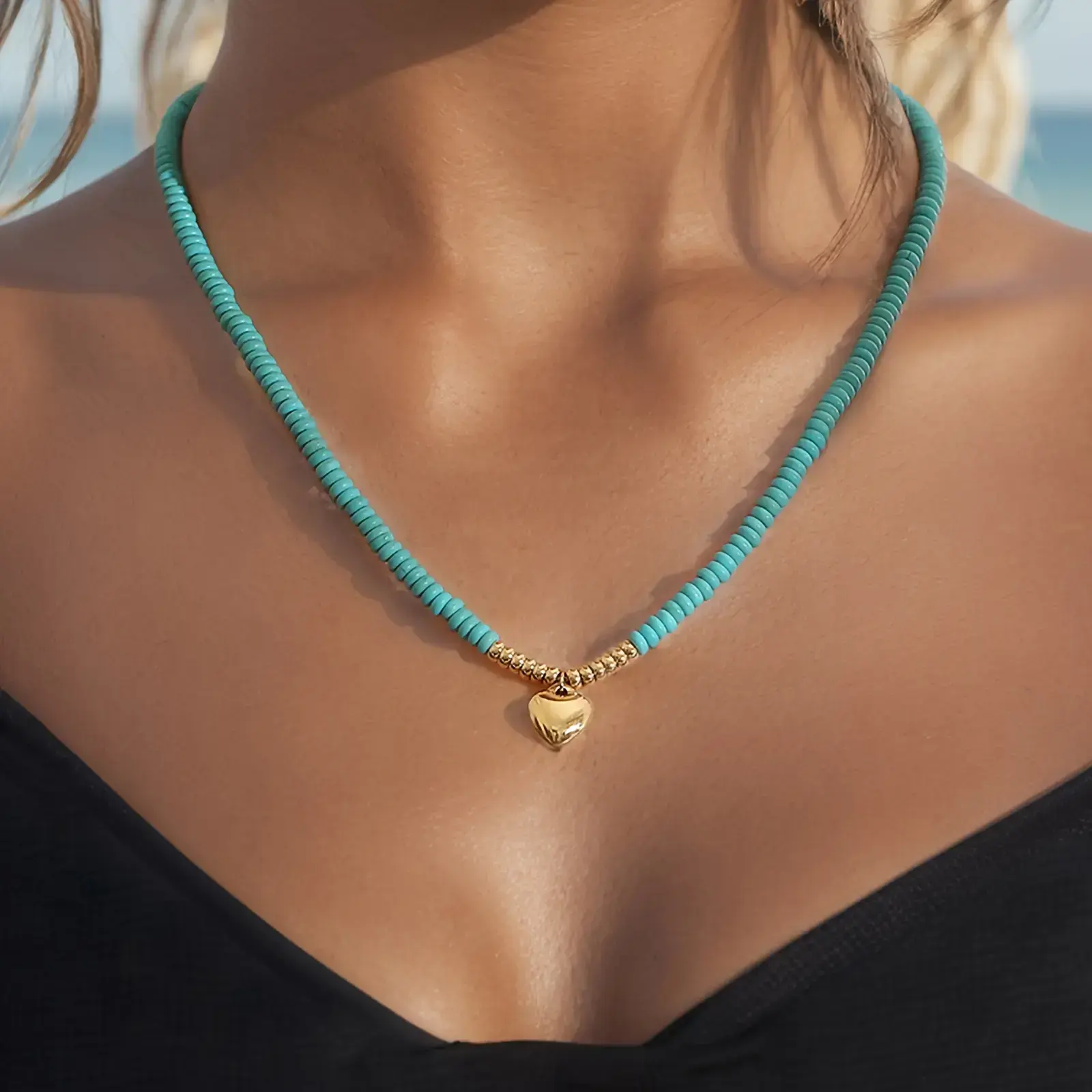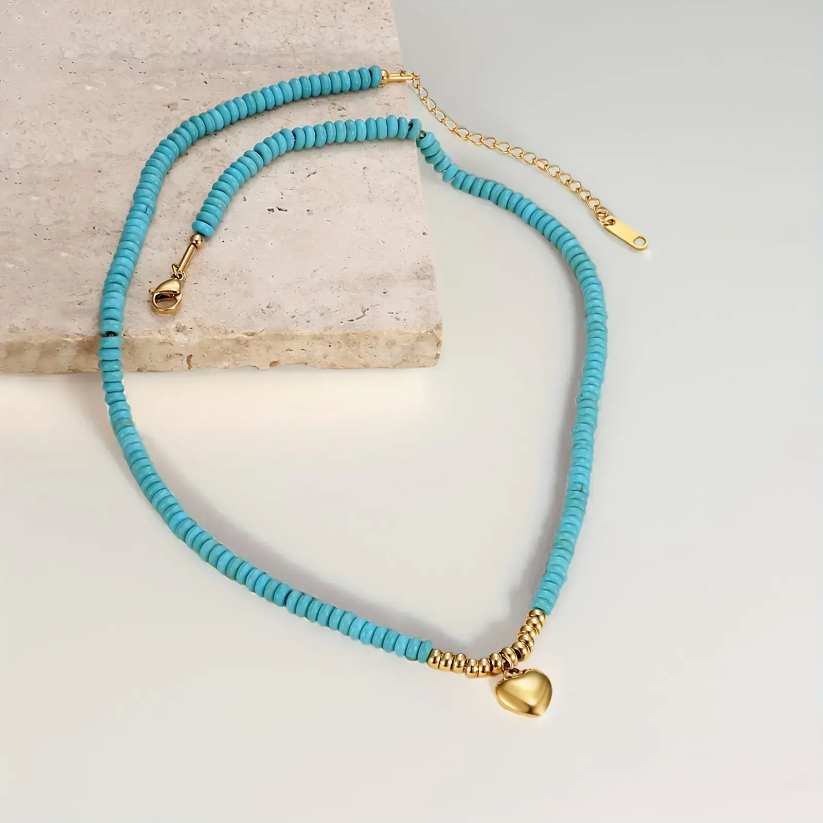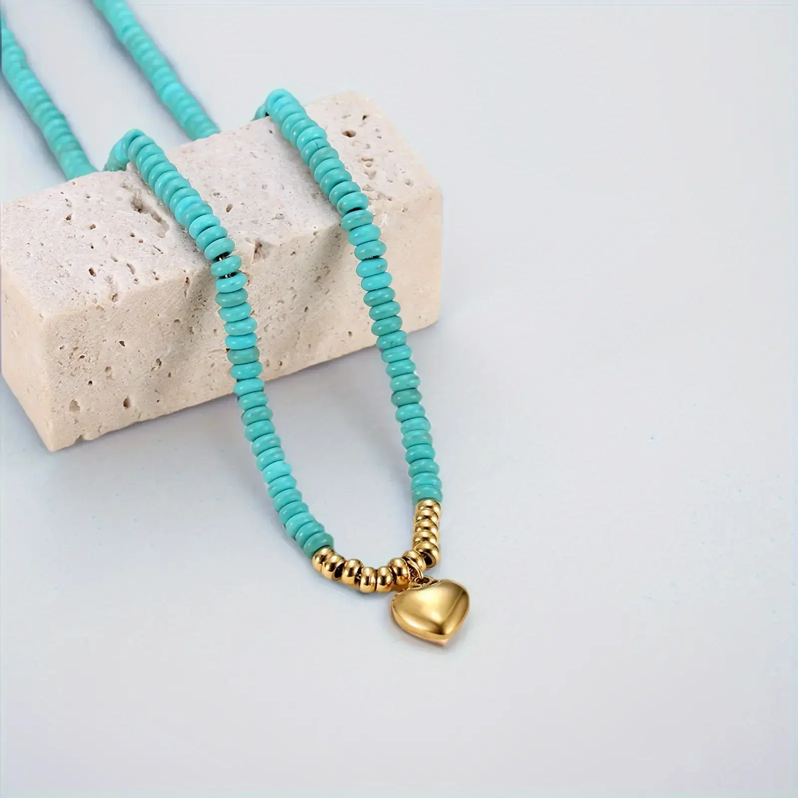 Boho-Chic Turquoise Beaded Necklace with Heart Pendant - Stainless Steel, Perfect for Vacation & Gifts