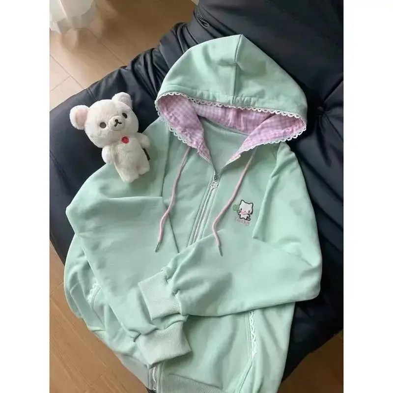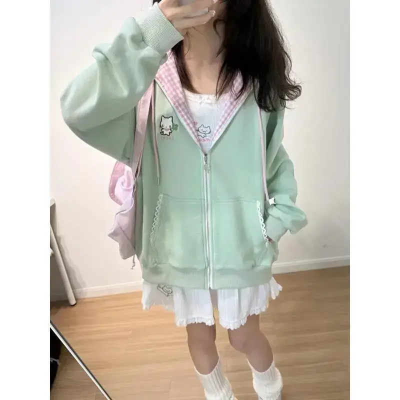 Thin Plaid Kitten Japanese Soft Girl Yameng House Series Two-dimensional Spring and Summer Long-sleeved Hooded Jacket Subcultural Girl
