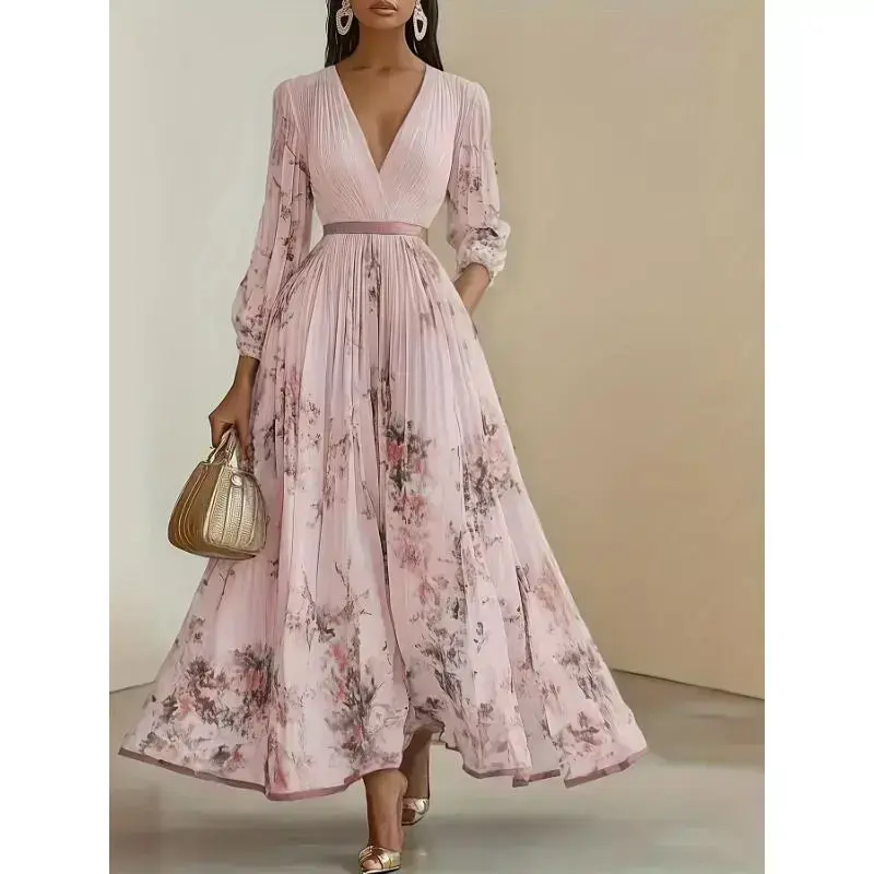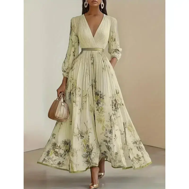 Elegant Olive Green V-Neck A-Line Formal Maxi Dress with Floral Lace Appliqué, Ruffled Bodice & Slit Hem - Machine Washable Women's Wedding, Party & Evening Gown, Wedding Dresses, Wedding Guest Attire, Vneck Design, Pleated Skirt Style, Hig