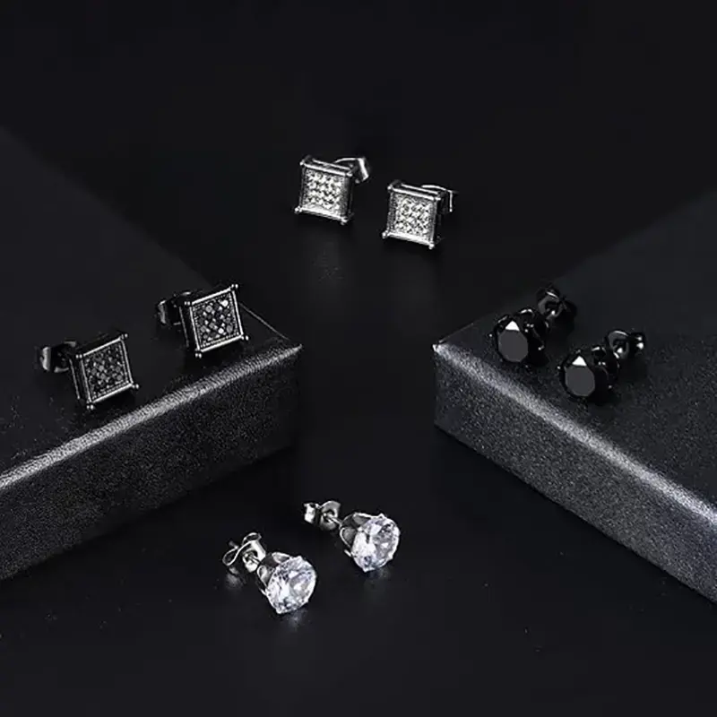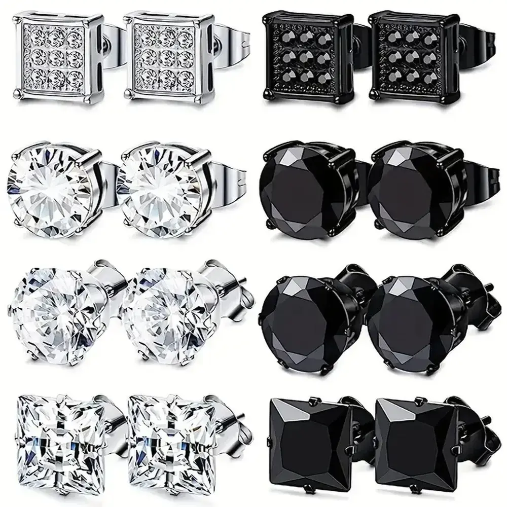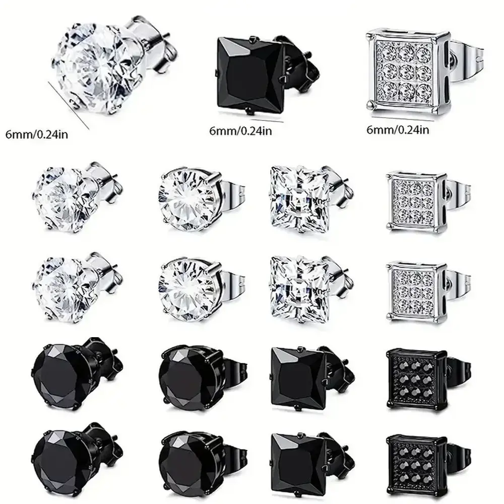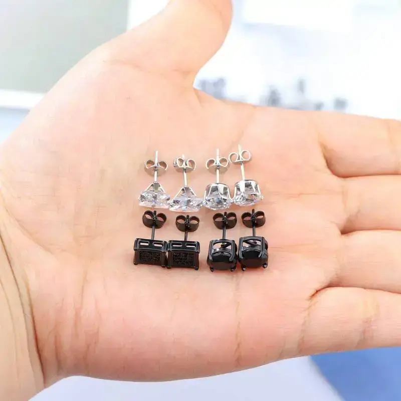 Men's and women's stainless steel earrings, silver black square earrings set, men's inlaid cubic zirconia 6MM