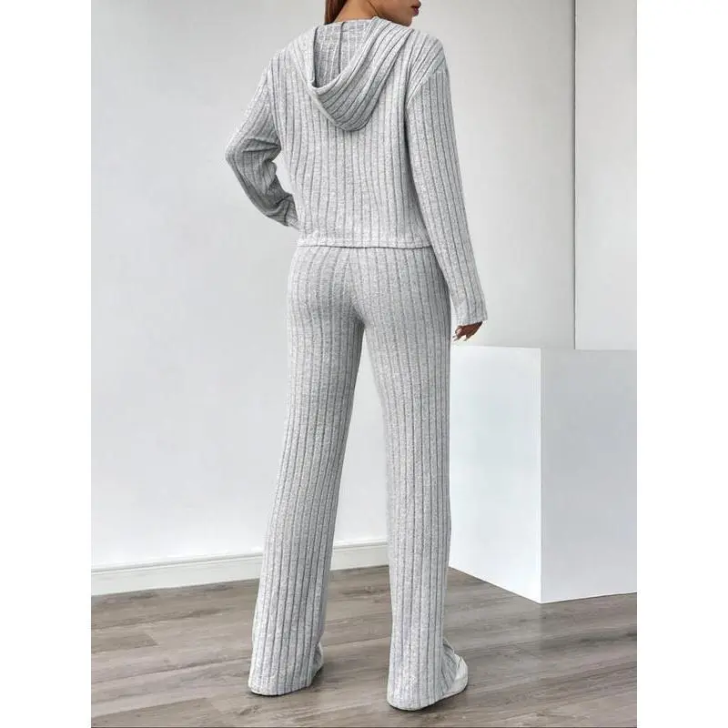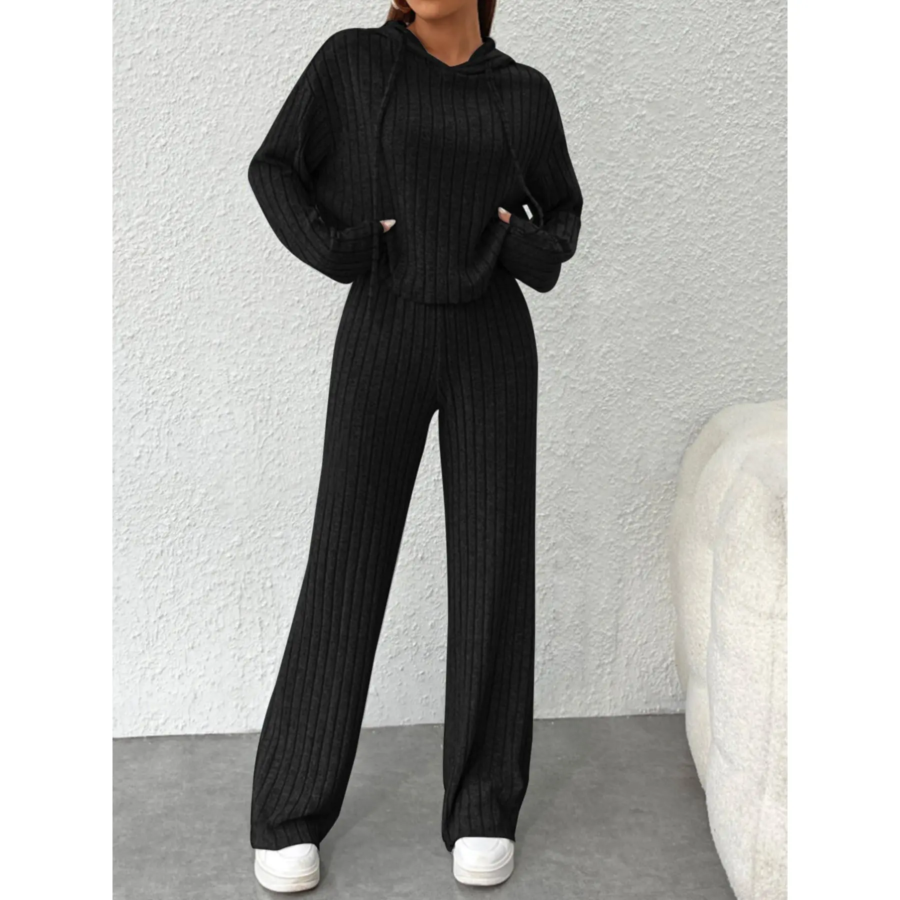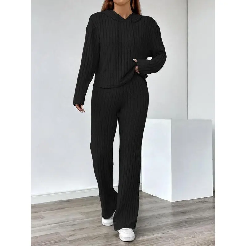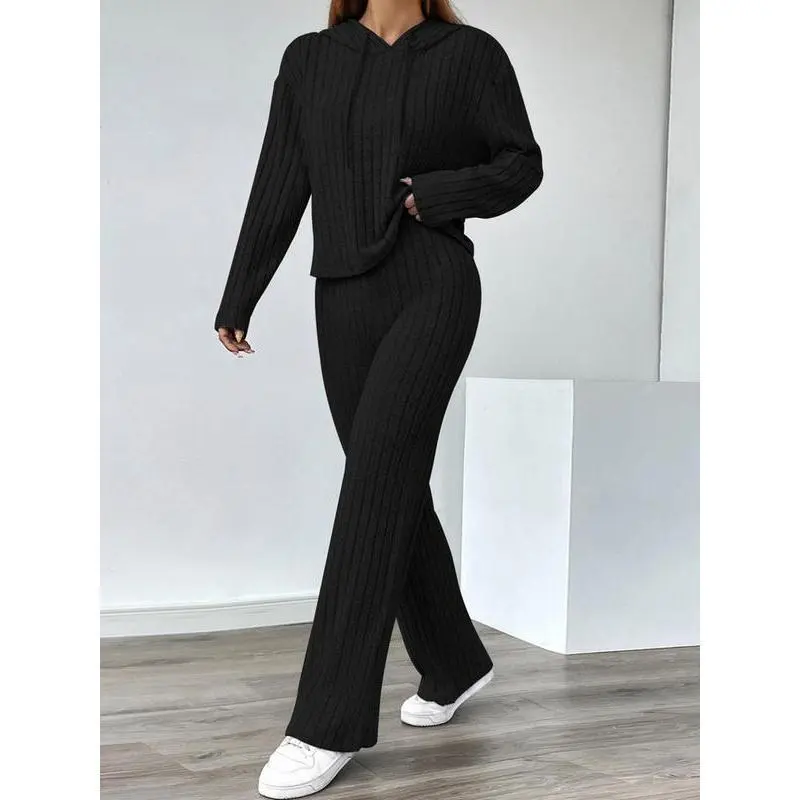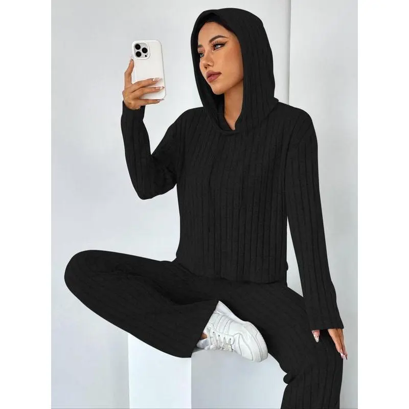 [Ribbed Texture]: Crafted from rib material, this outfit offers a unique texture that enhances breathability and provides a cozy feel against the skin. [Hooded Feature]: The hooded sweatshirt adds a practical element for warmth and protection against the elements, making it ideal for daily outdoor activities. [Drawstring Adjustment]: Featuring a drawstring allows for easy adjustment of the top and pants, ensuring a secure and personalized fit for every body type. [High Waist Fit]: The high waist design of the pants offers extra coverage and stylishly enhances the silhouette while providing comfort in movement. [Long Sleeve]: With long sleeves, this outfit is perfect for layering or wearing alone, providing warmth and flexibility across different seasons.