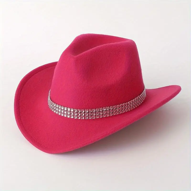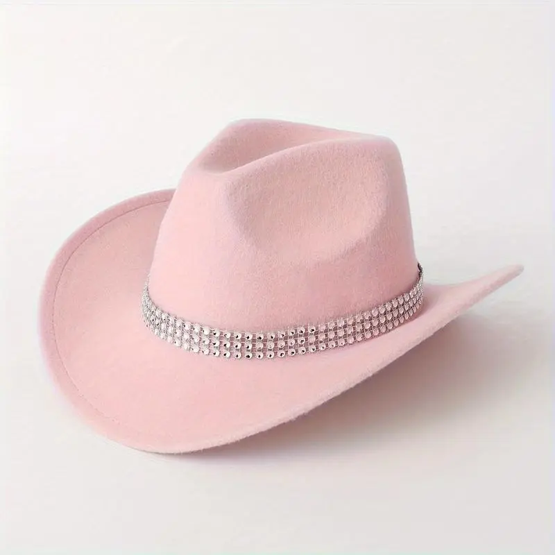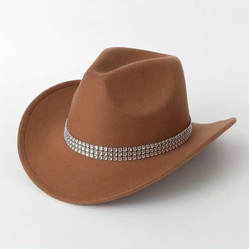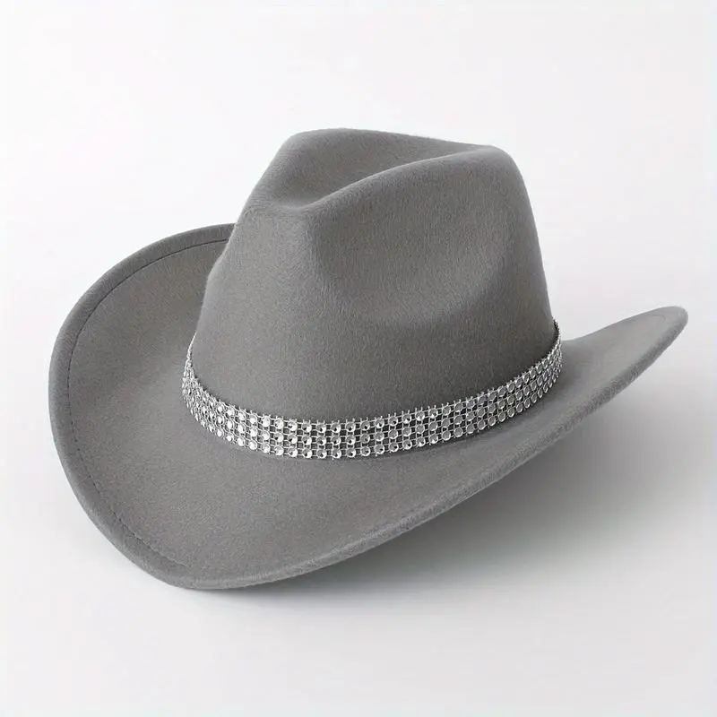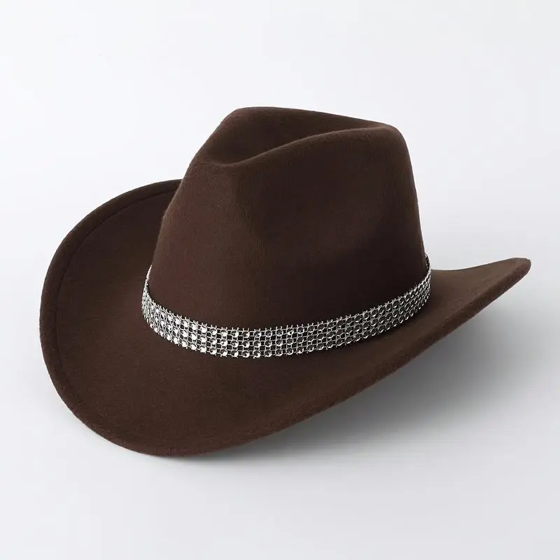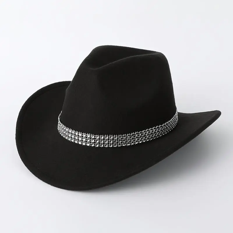 Unisex Felt Cowboy Hat with Rhinestone Band Elevate your style with this unisex felt cowboy hat, designed for both performance and festive occasions. This simple wide-brimmed fedora hat is perfect for parties, performances, and other special events.54-61cm Whether you're attending a party, a performance, or a festive gathering, this unisex felt cowboy hat is the perfect choice to elevate your look.