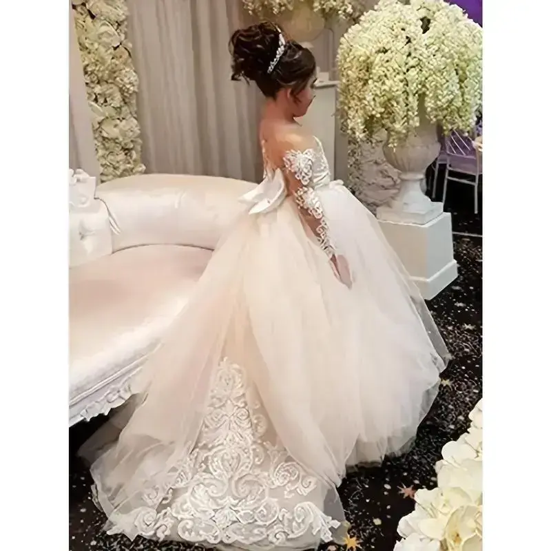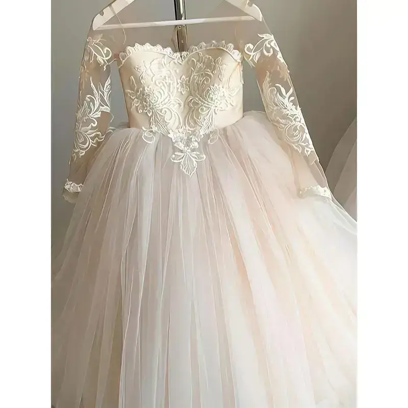 1pc Girls' 9/16 Sleeve Puff Sleeve Princess Dress with Big Bow, Elegant Long Tulle Wedding Dress for Youngsters, 12 & Under, A-Line Silhouette, Polyester, Dry Clean Only, Perfect for Performances & Special Occasions