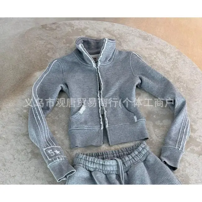 Sports Suit Gothic Style Women's Zipper Sweater Pants Two-Piece Y2g Harajuku Letters Patchwork Embroidery Vintage Oversized Coat & Trousers Suit