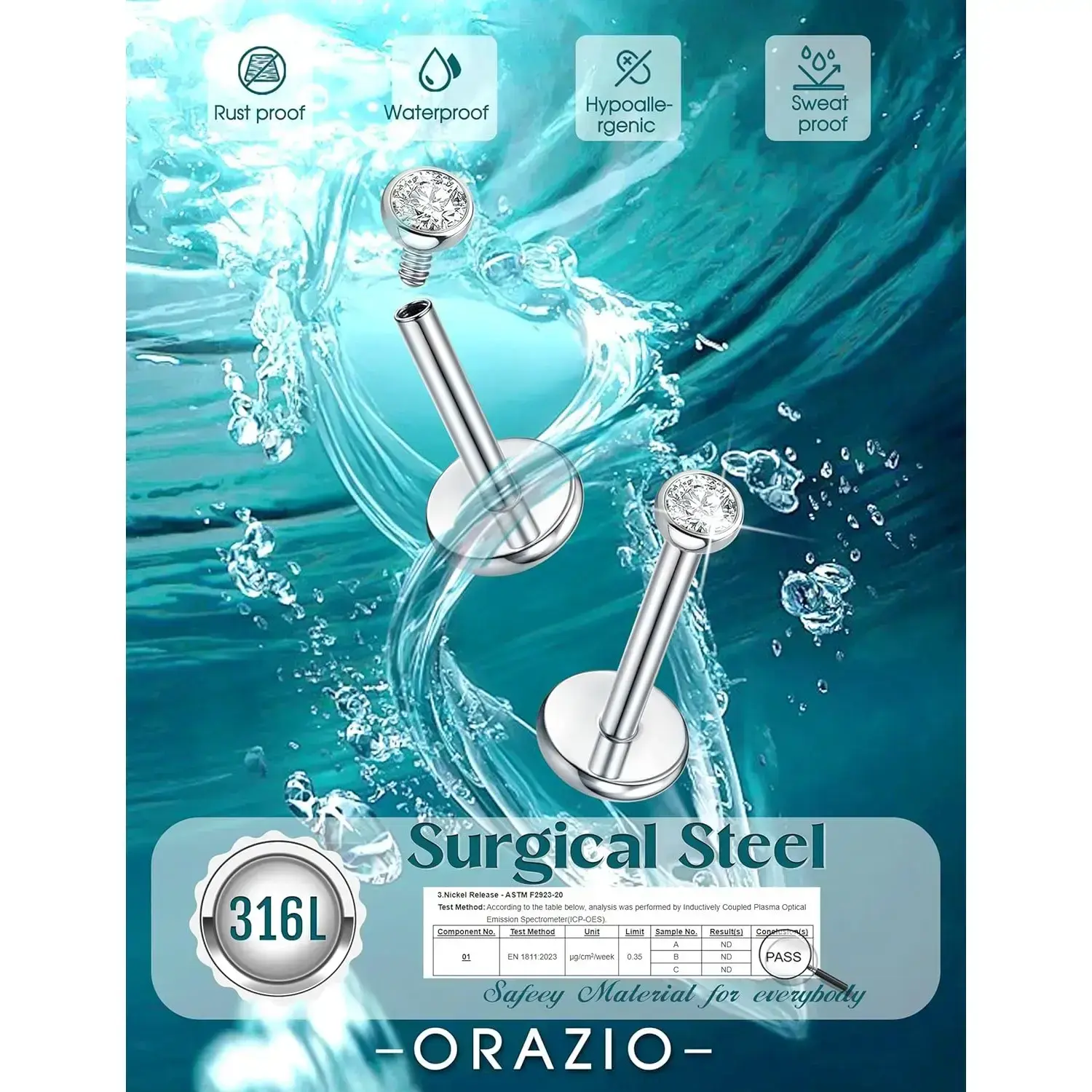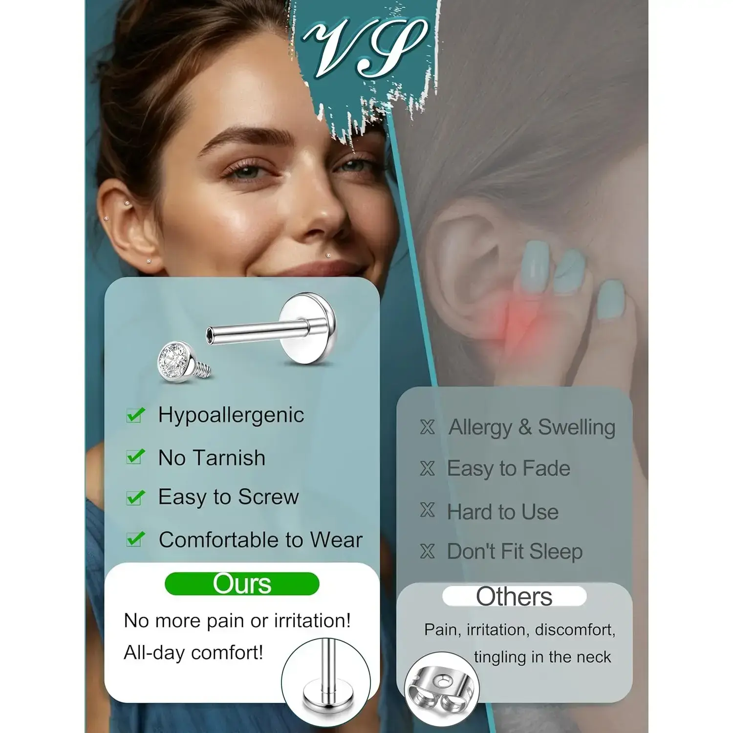 Flat back ear studs, 16G/18G 316L surgical steel internal thread CZ ear studs, hypoallergenic conch cartilage spiral ear studs, tragus perforation jewelry lip lip lip, Medusa nose studs, suitable for both men and women
