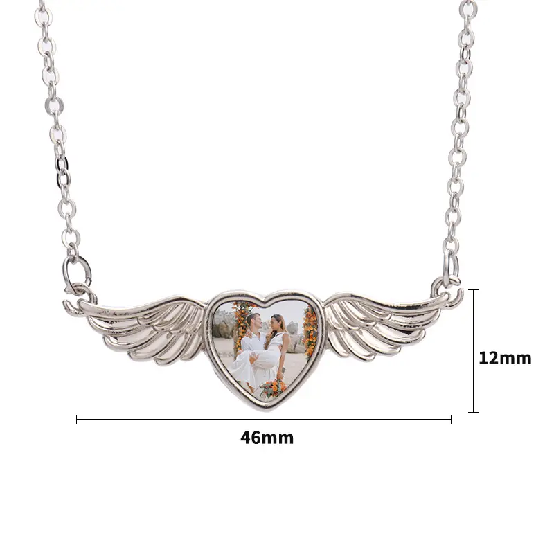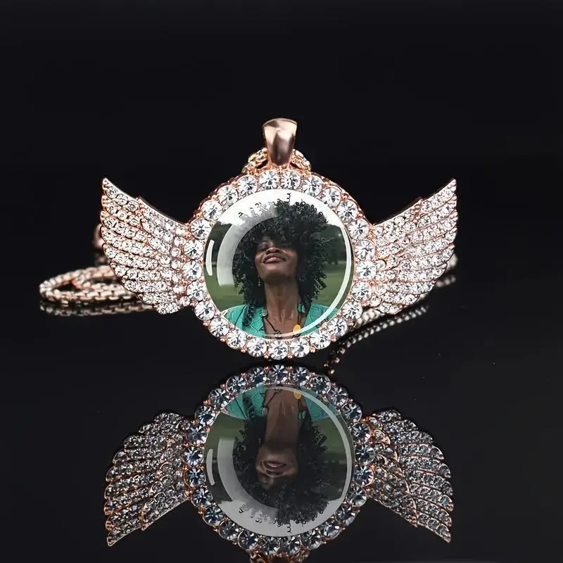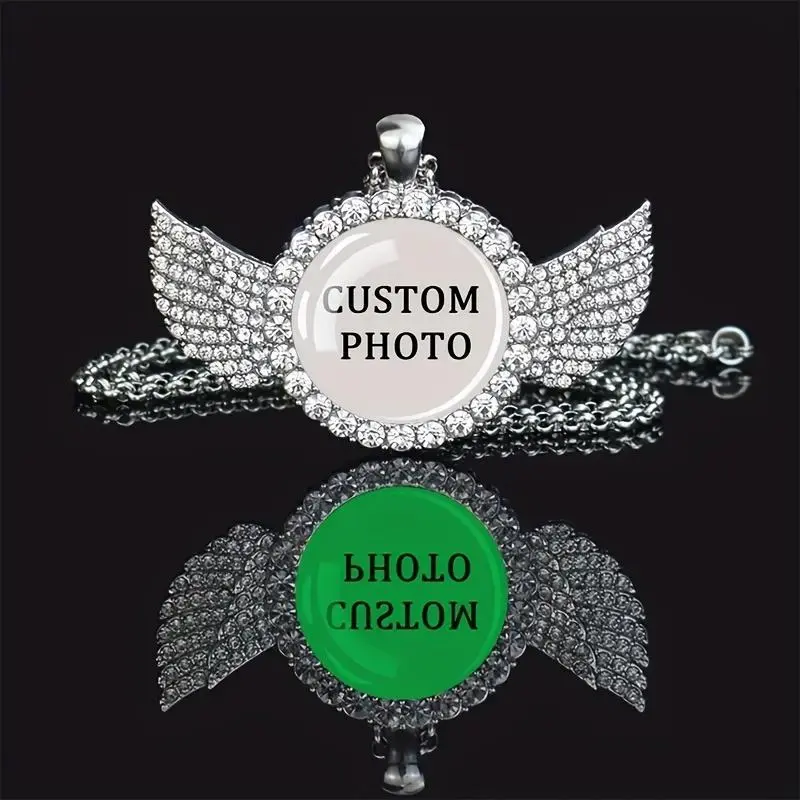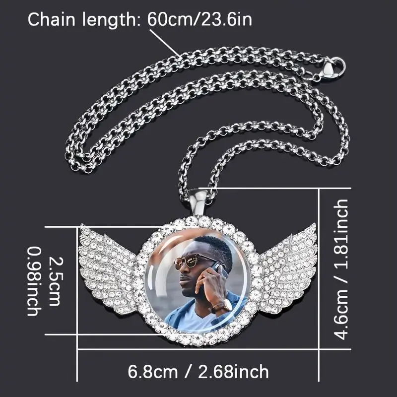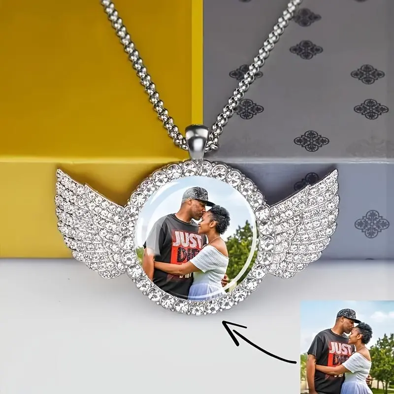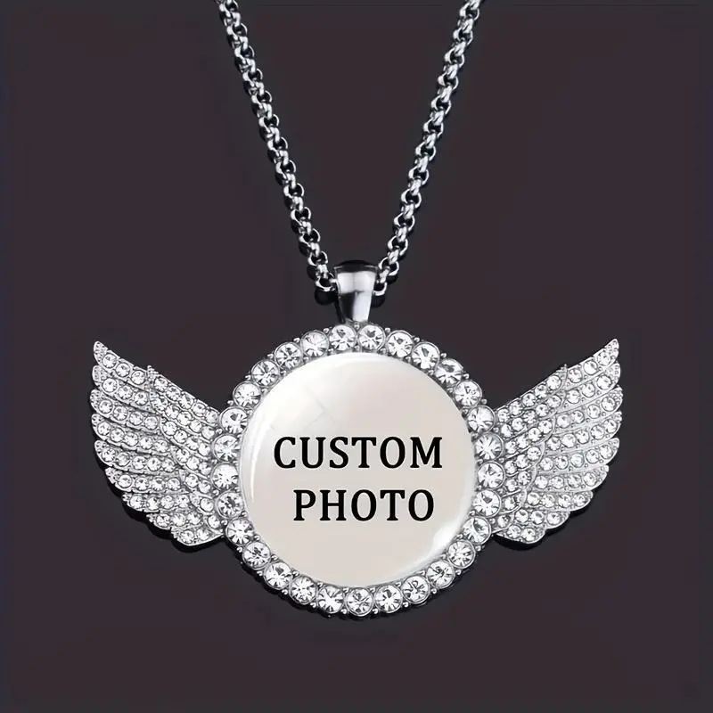 Custom Photo Pendant Necklace With Angel Wings Design, Personalized Hip Hop Rock Zinc Alloy Jewelry With Crystal Decoration, Punk Style Unplated Glass Dome Picture Necklace For Men And Women - Unique Gift Idea mens jewelry elegant accessory chain woman