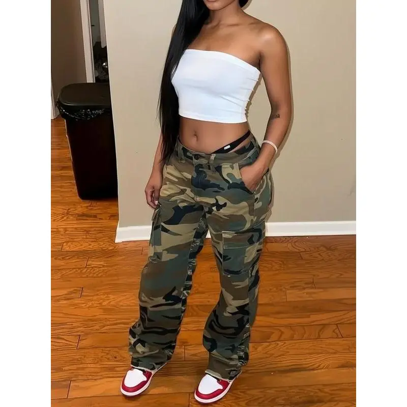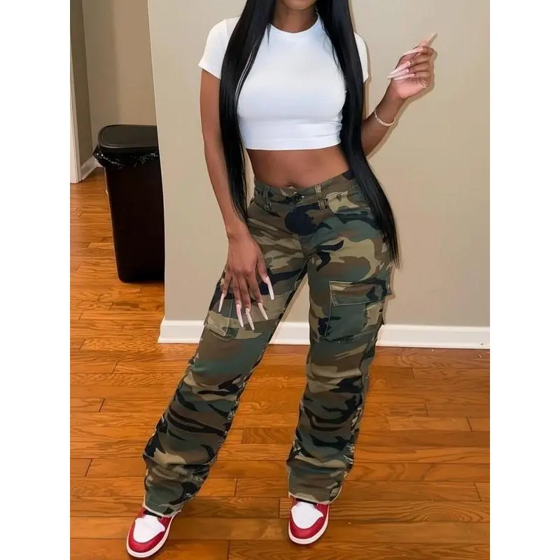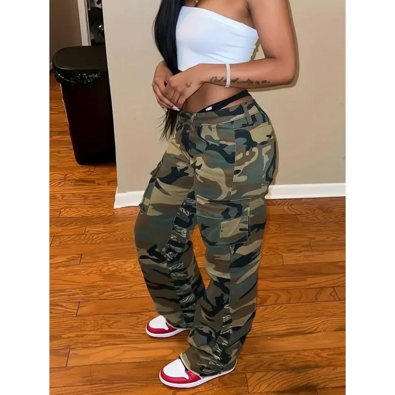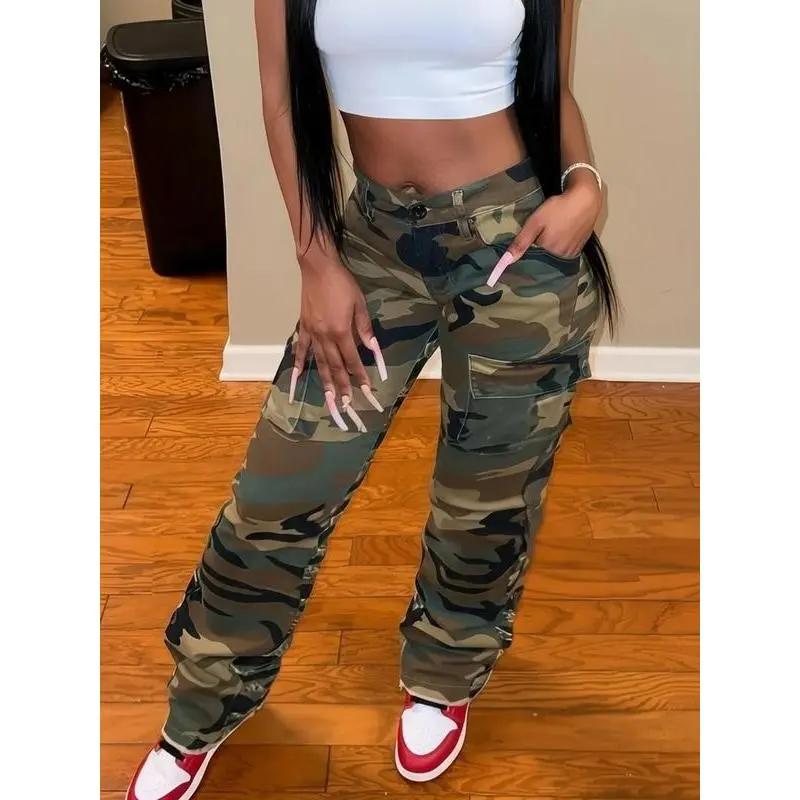 EasterGiftWomen'sHighRiseFlapPocketCargoJeansArmyGreenCamouflageTrousersLadiesPartyNewYearWarmThermalCamoStyle