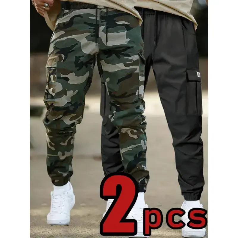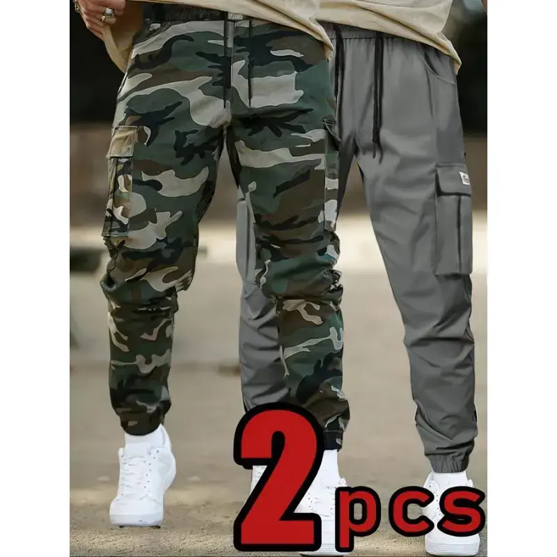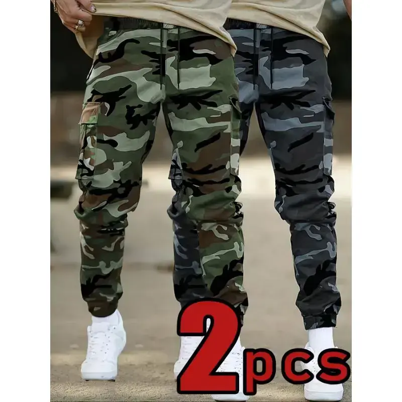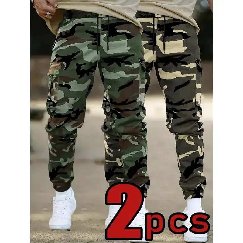 Camo Cargo Pants, Casual Polyester Joggers with Drawstring Waist, Multiple Pockets, and Cuffed Ankle, Non-Stretch Woven Fabric, Regular Fit