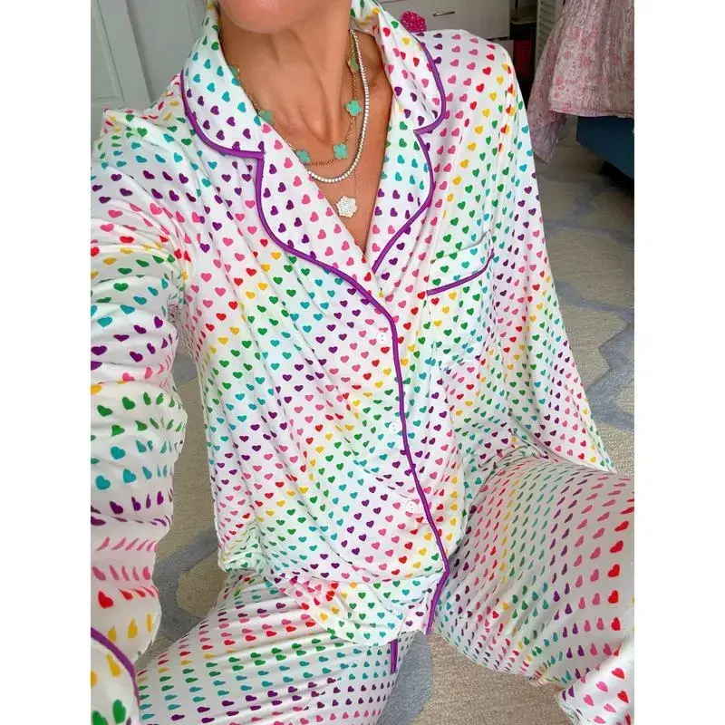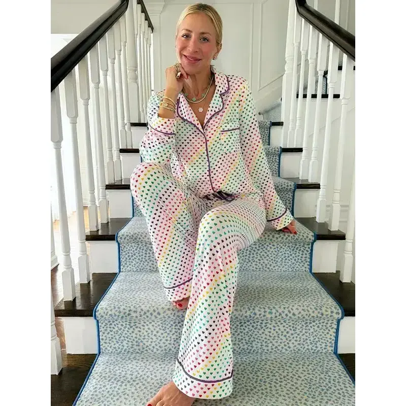 Brighten up your loungewear with the Rainbow Hearts Wide Leg Pajama Set from Sunshine Sisters! Featuring playful, colorful hearts on a soft white background, this set adds a fun and chic touch to your nighttime routine. The long-sleeve button-down top and wide-leg pants are crafted from our signature ultra-soft, stretchy fabric for a snug yet breathable fit. Perfect for lounging at home or cozy nights in, this set is available in adult sizes XS to 3XL and fits true to size. These PJs are a must-have for anyone seeking style and comfort! Color: Rainbow hearts on a white background Material: 90% Polyester / 10% Spandex Sizes: Available in women's sizes XS to 3XL Fit: True to size. Jordann is 5'8" and wearing a medium. Care Instructions: Machine wash cold, tumble dry low Indulge in the fun and comfort of this limited edition set—perfect for year-round wear or as a thoughtful gift. Don’t wait, these will sell out fast!