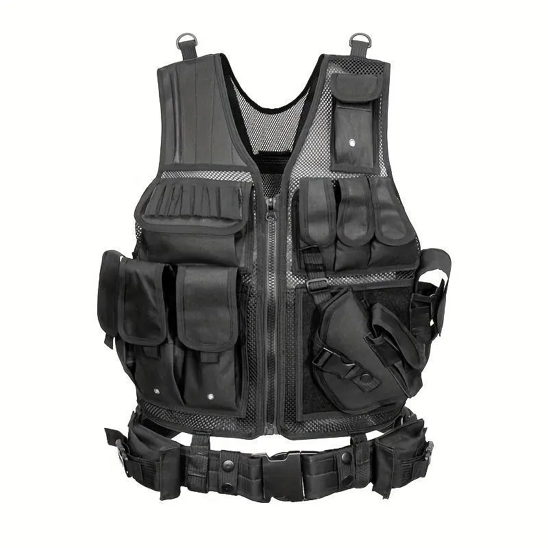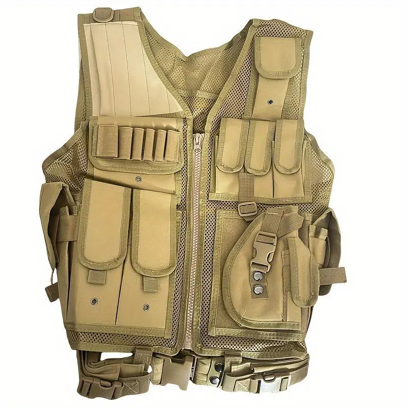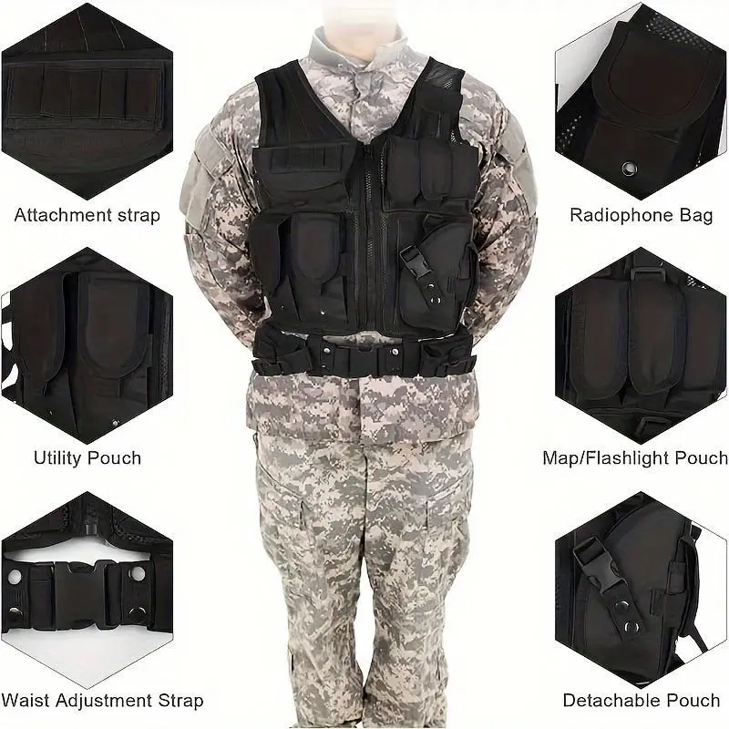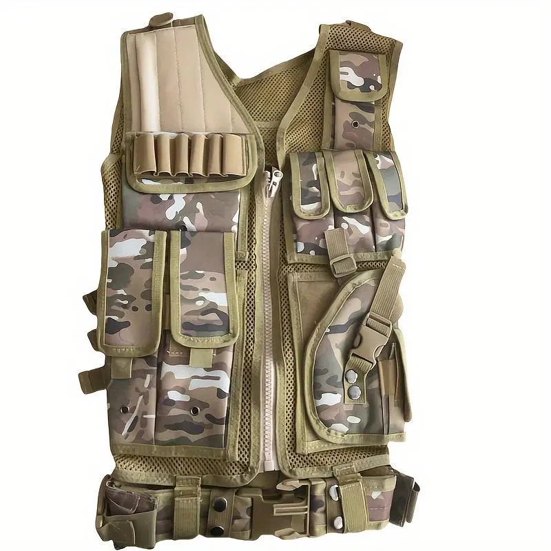 Multi-FunctionalCamoAdjustableTacticalSurvivalVest-DurablePAMaterial,BreathableMeshBack,MultiplePockets&CustomizableAttachments-Fits110-176lbs,PerfectforHiking&WildernessExploration,CampingGearChestProtector