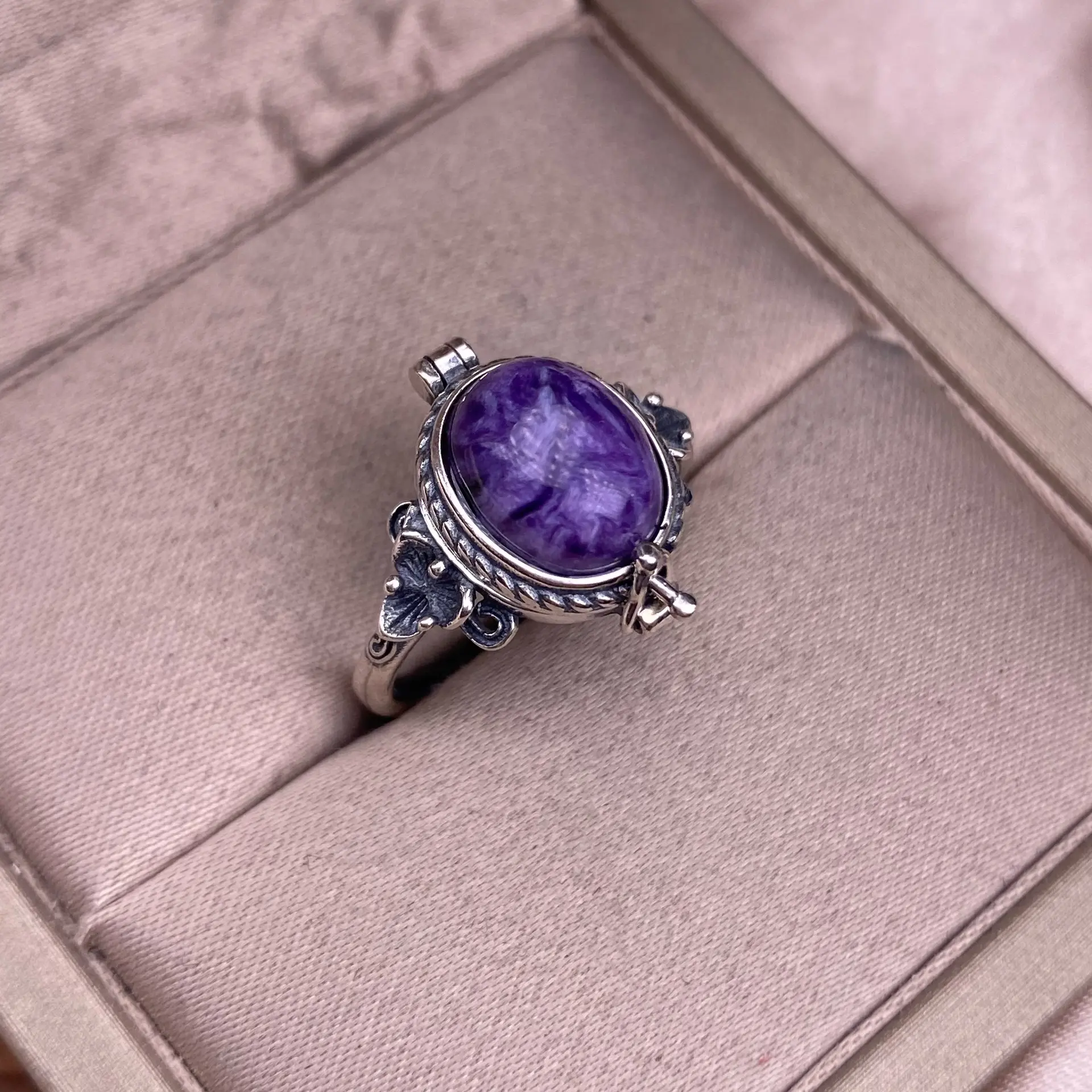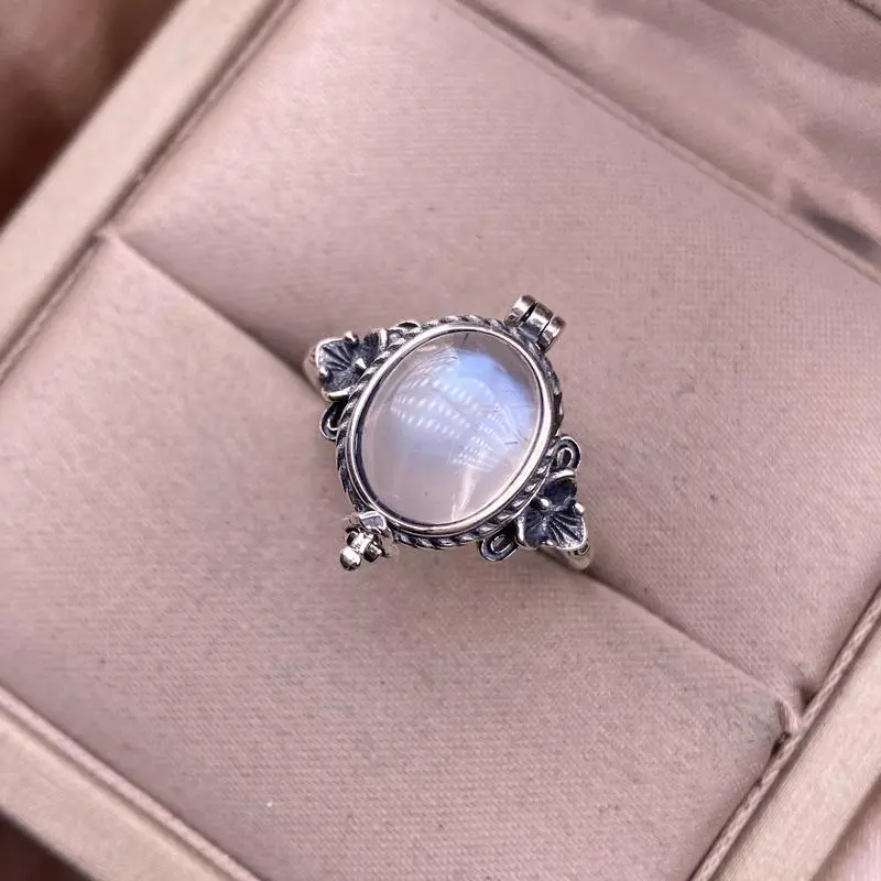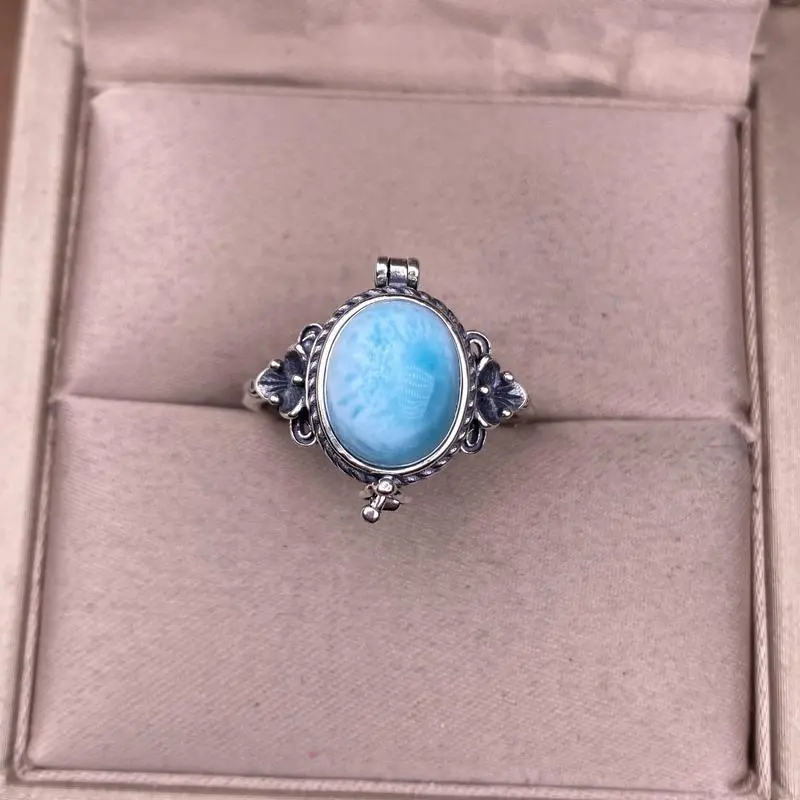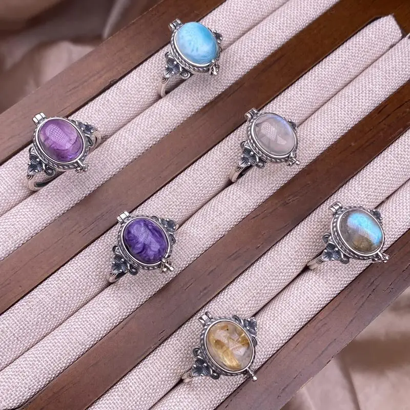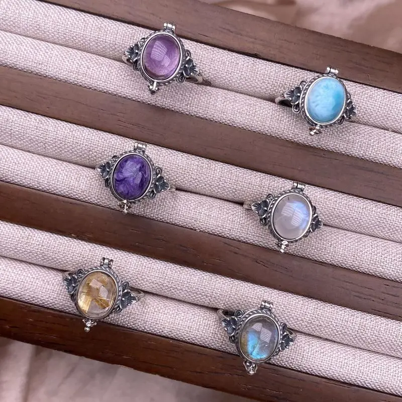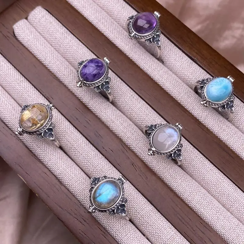 Natural Crystal Larimar Amethyst Moonstone Labradoriate Vintage Jewelry Sterling Silver Ring for Women, Boho Statement Large Stone Gemstone Ring Bohemian Jewelry Box Shape Retro Kawu Style Ring