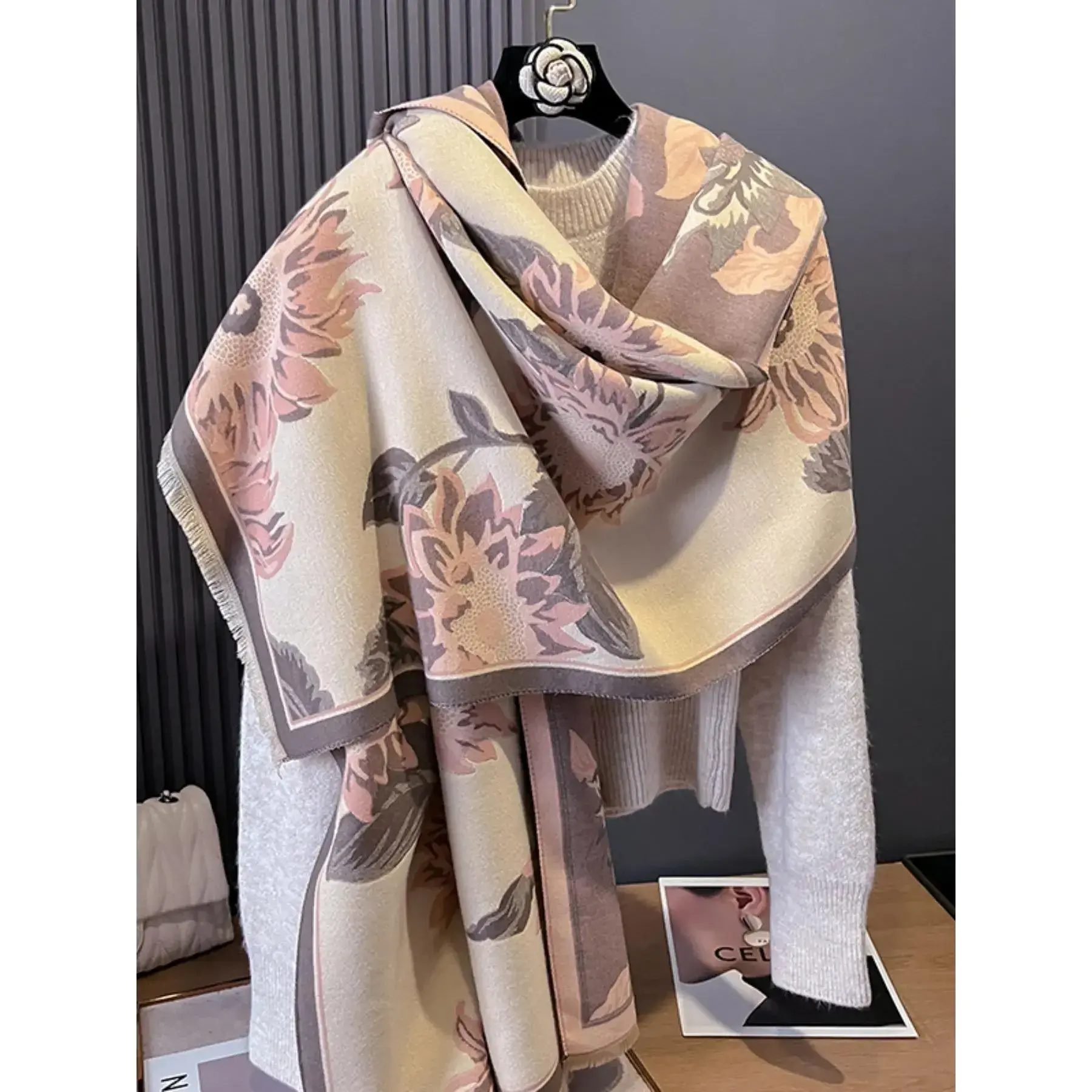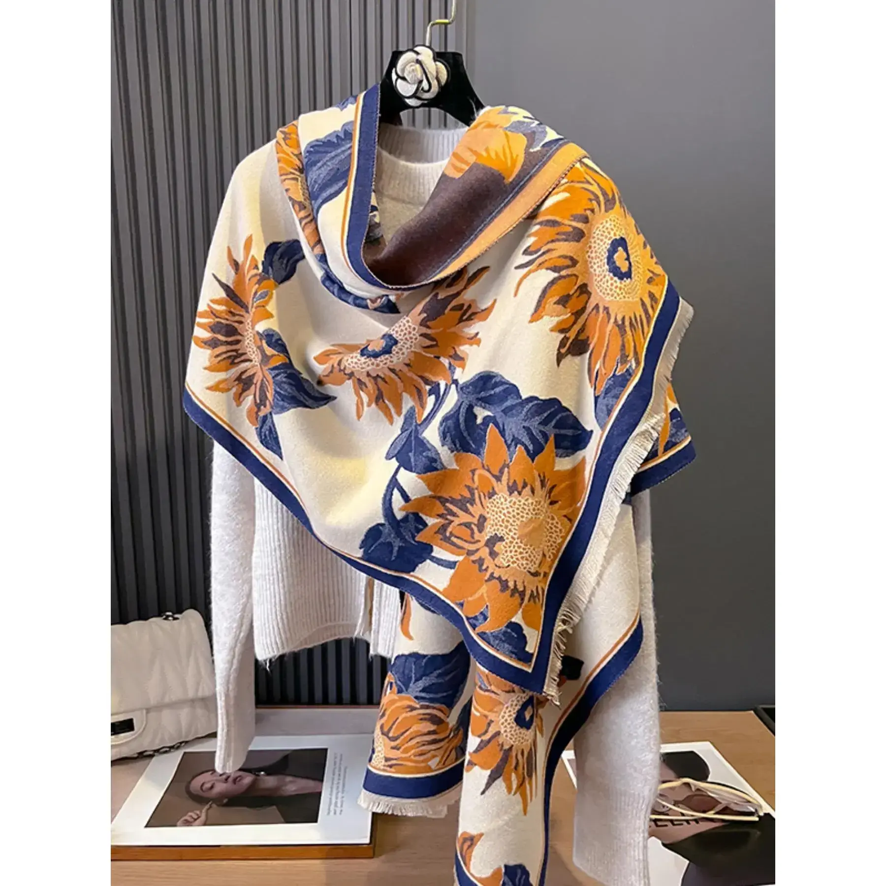Sunflower Pattern Double Sided Soft Warm Scarf, Boho Style Thick Warm Shawl for Women, Fashion Accessories for Fall & Winter