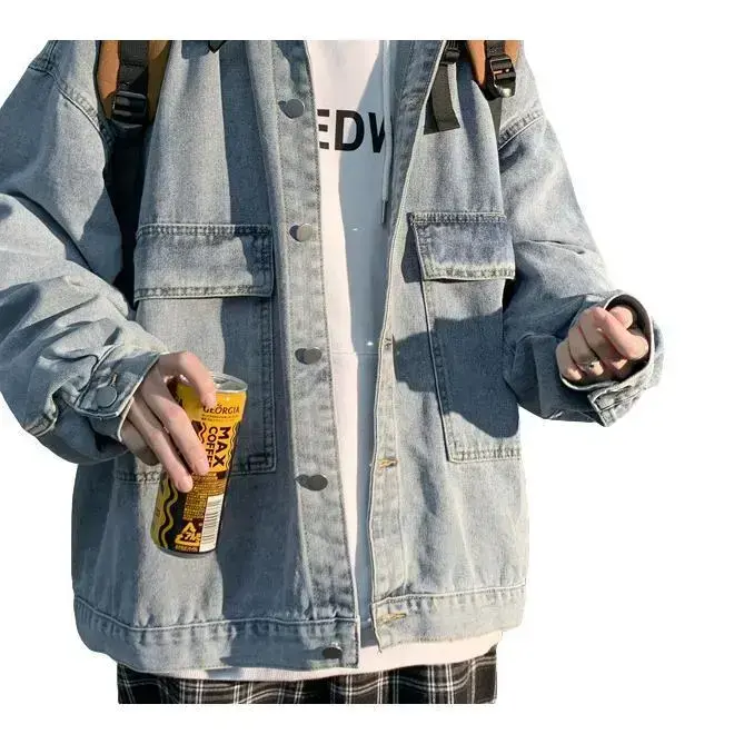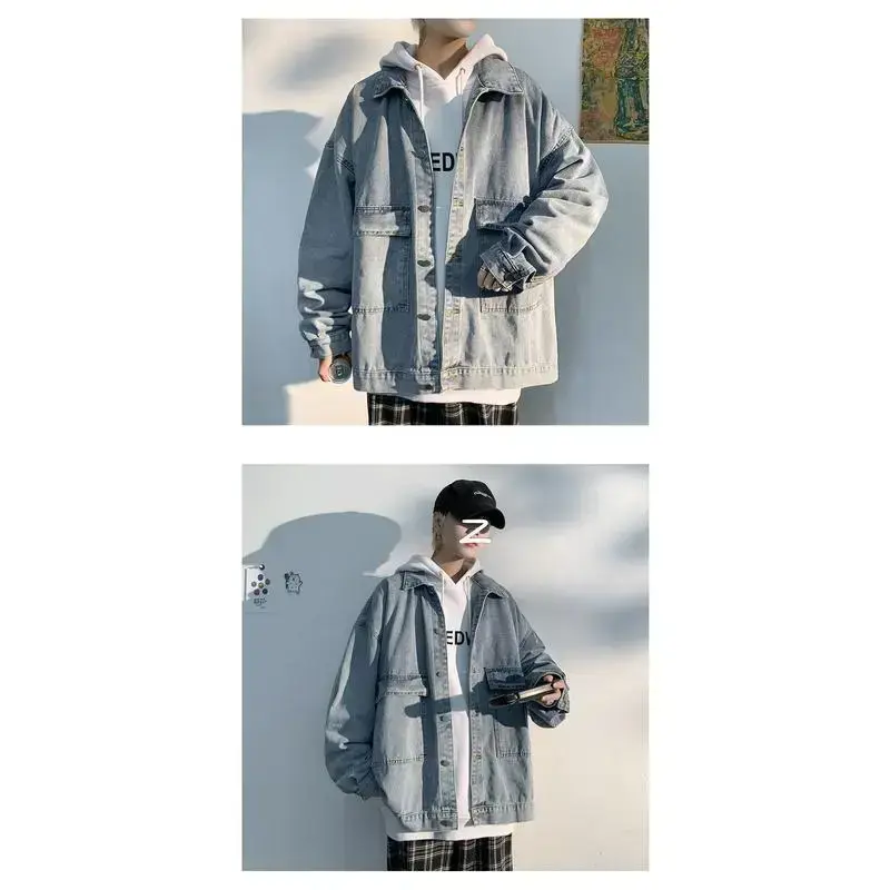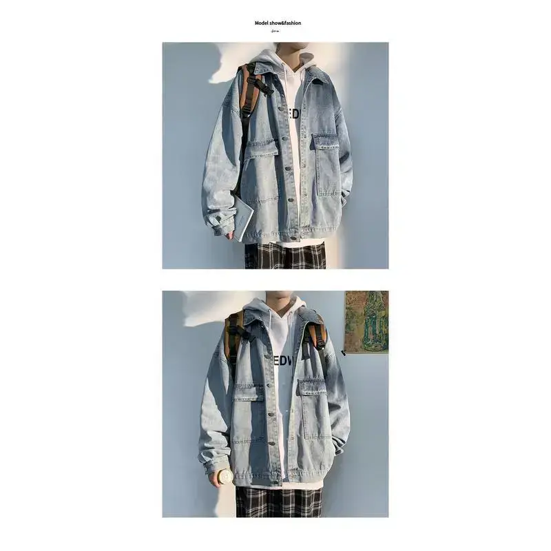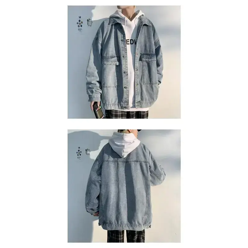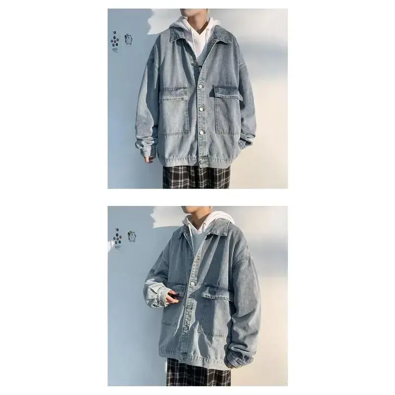 American High Street Denim Jacket for Men Vintage Workwear Coat with Oversized Utility Pockets Minimalist Loose Fit Autumn Jacket