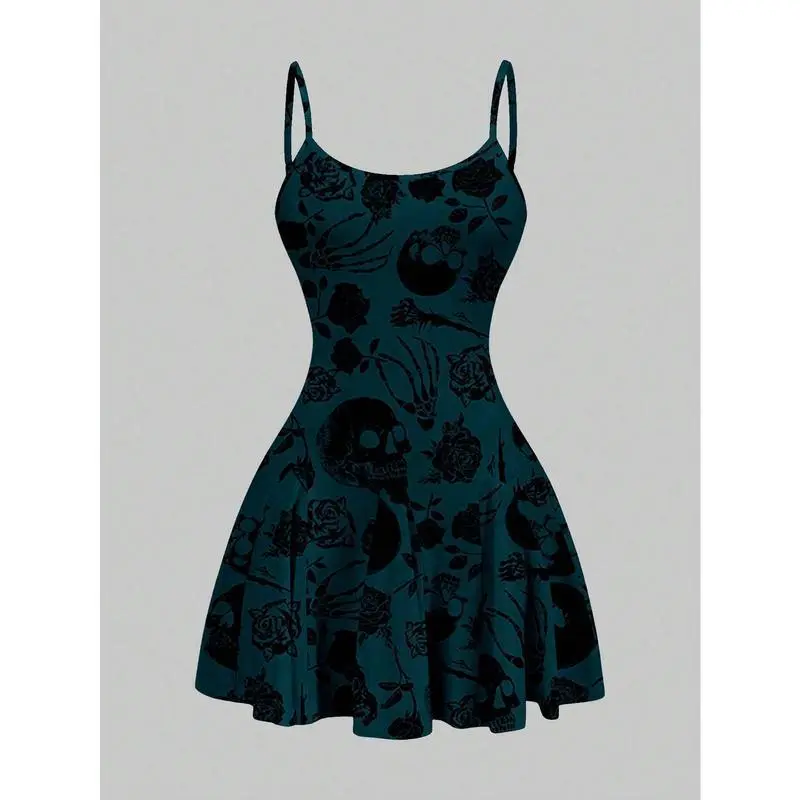 Casual Skull & Rose Pattern A-Line Mini Dress For Women, Suitable For Summer,Summer Dresses,Sun Dress Spring Clothes Cute Dresses For Women Woman Dress Women Dresses Women Clothing Dresses Womenswear Piece