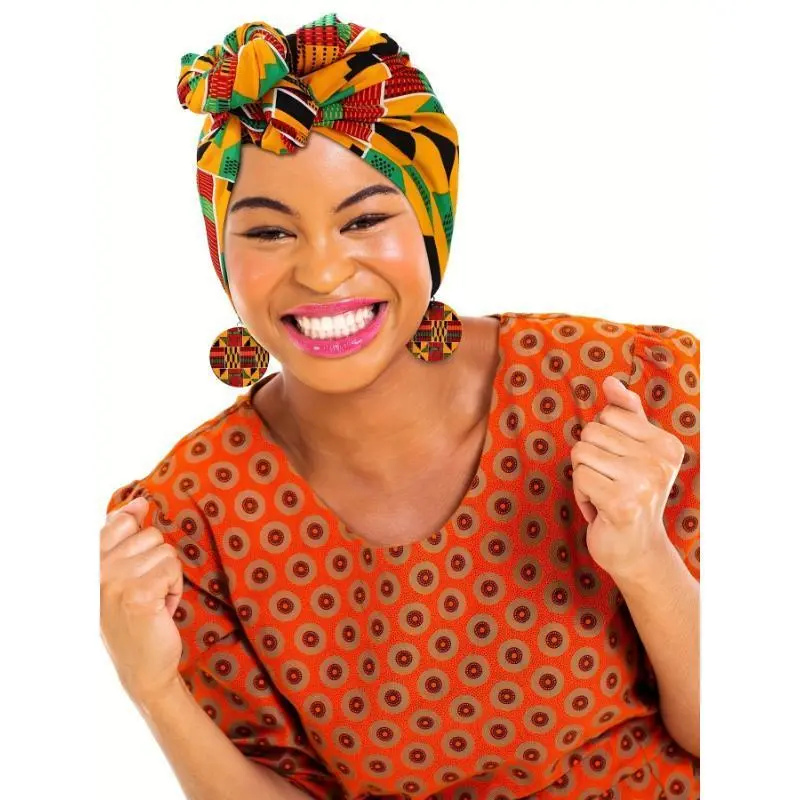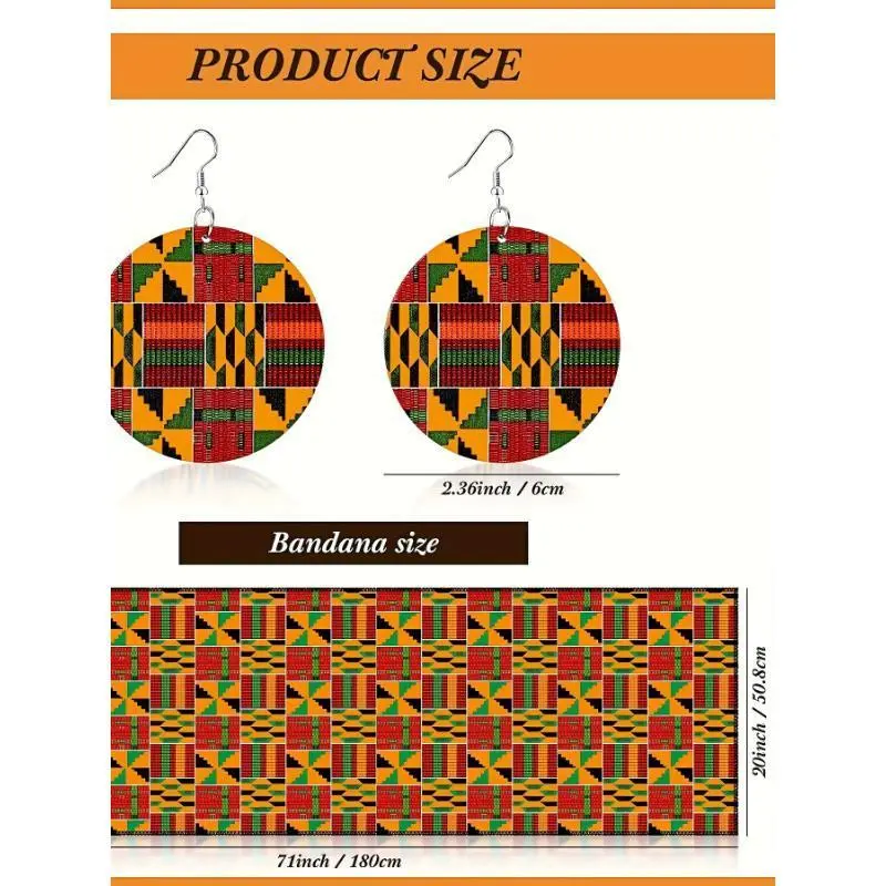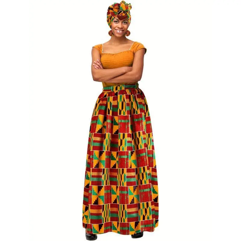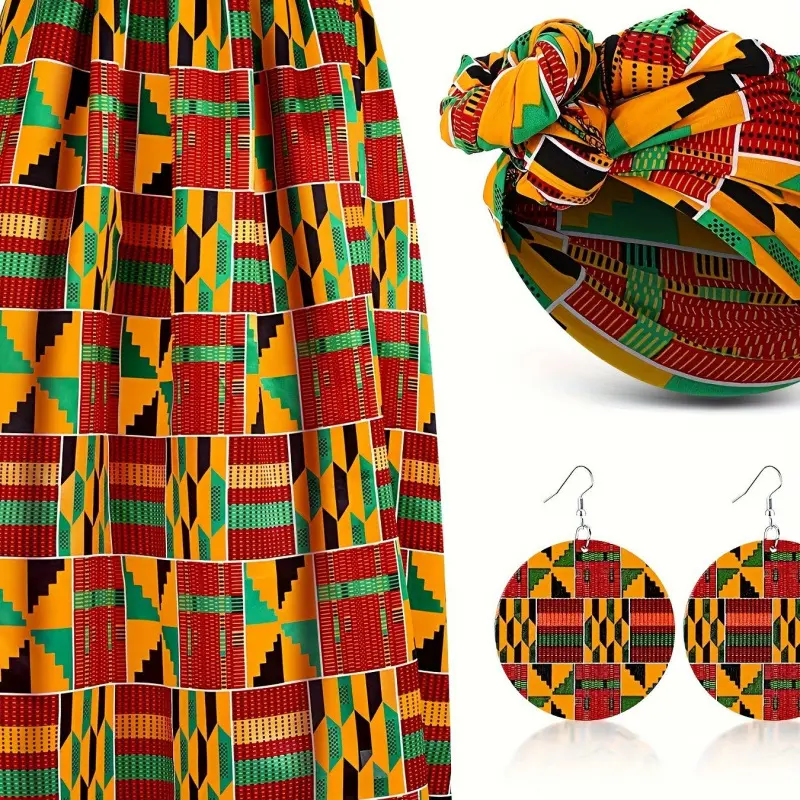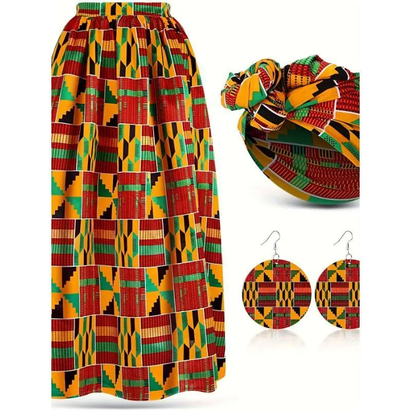 3pcs Women African Printed Maxi Skirt with Pockets Set Casual Stretch Head Wrap Scarf Drop Dangle Earrings