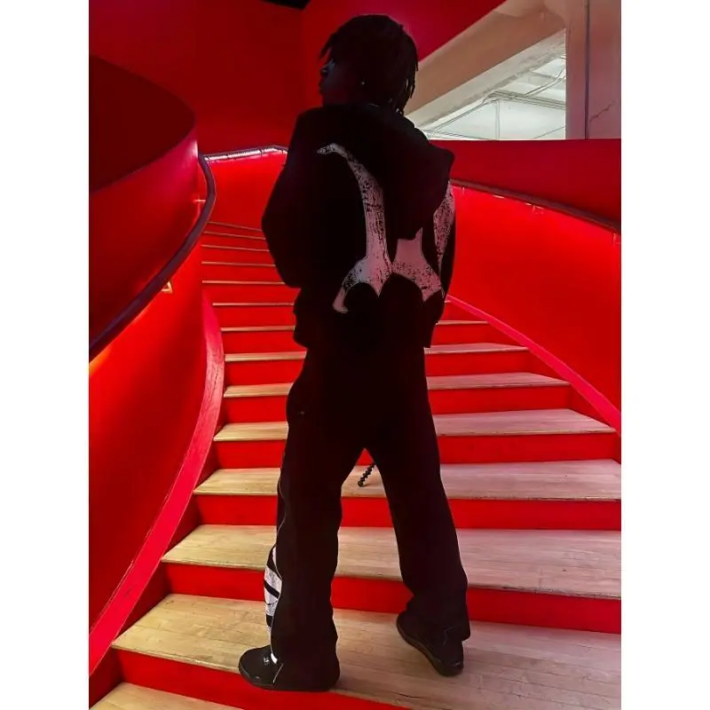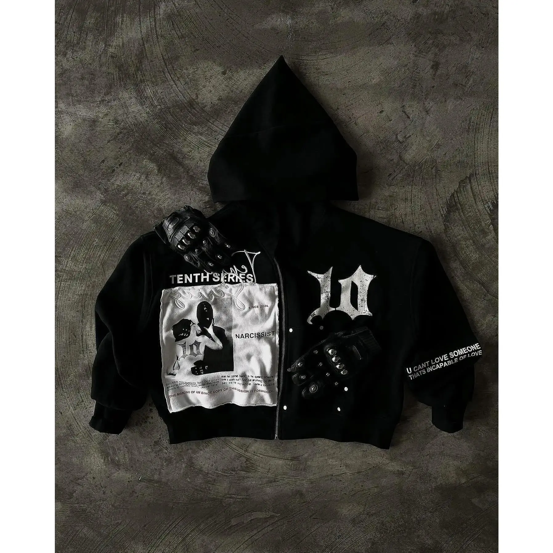 Unisex Oversized Zip-Up Hoodie with Graphic Patchwork Design & Glove Detail - Y2K Harajuku Streetwear Sweatshirt, Black Casual Pullover for Fall Winter Layered Look, Autumn Streetwear, Comfortable Wear Menswear Sleeve Fabric Polyester Stretch Tops