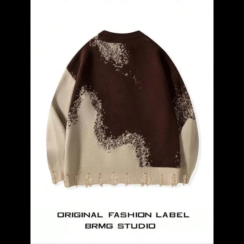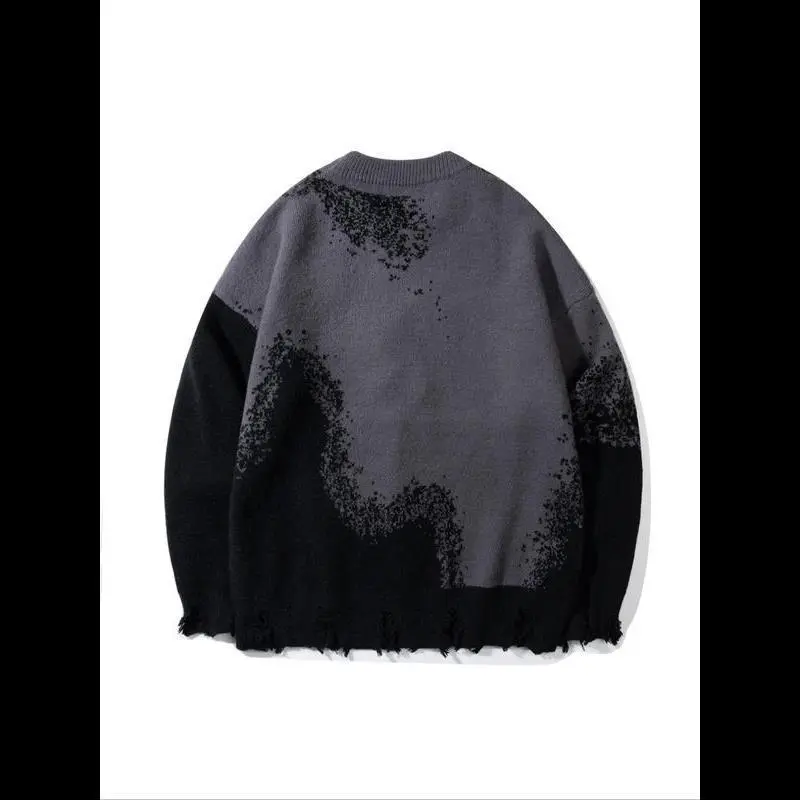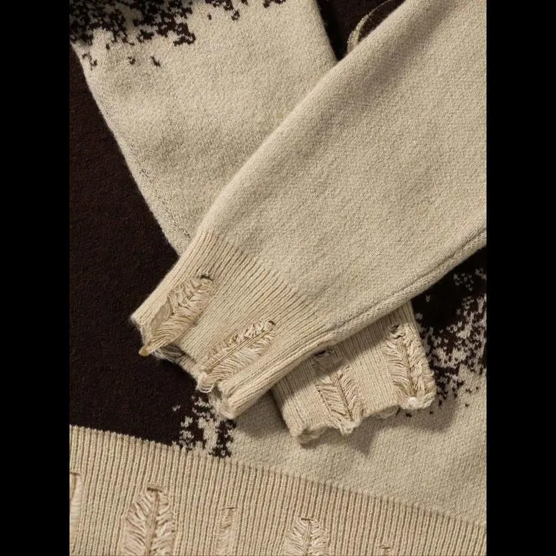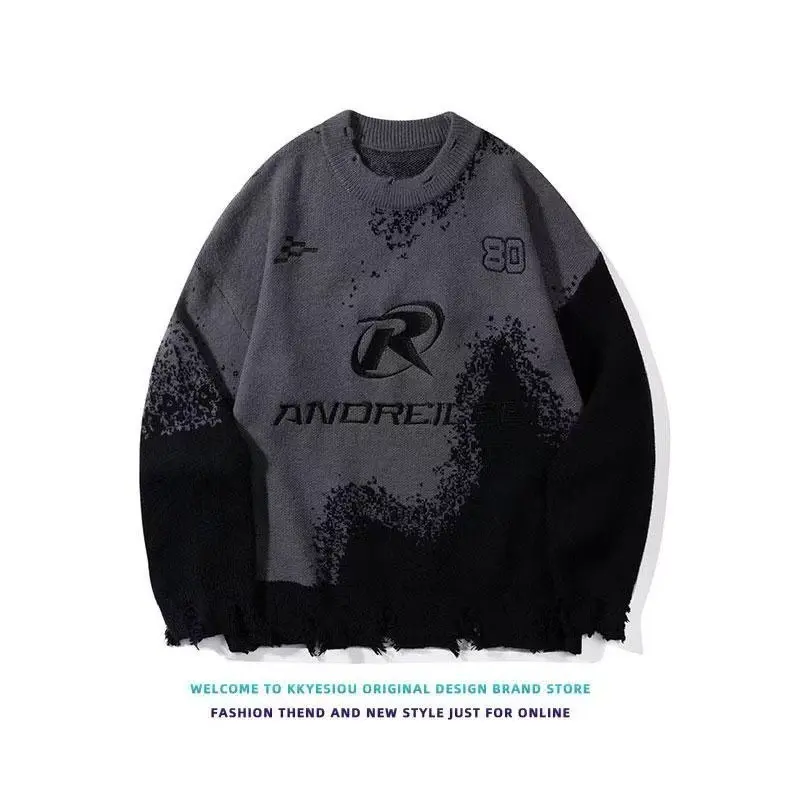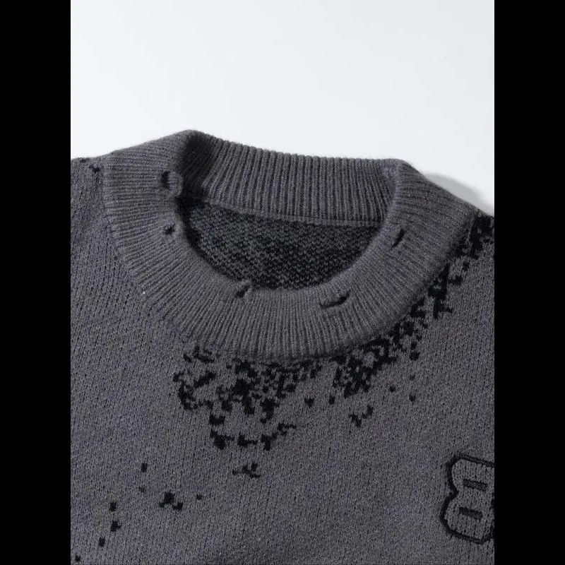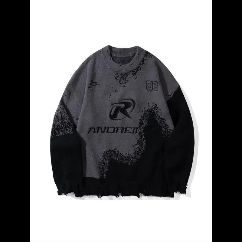 【Distinctive Patterns】: Features eye-catching letters and figures that set this sweater apart, making it an authentic addition to your wardrobe./【Ripped Hem】: The raw hem detailing adds an edgy flair, distinguishing it from conventional sweaters while enhancing your ensemble./【Loose Fit】: Designed for a relaxed silhouette, it ensures a free movement for everyday activities, making it ideal for leisure outings./【High-Quality Materials】: Crafted from acrylic and polyamide, it combines durability with a soft texture, providing a cozy feel without compromising longevity./【Drop Shoulder Sleeves】: The drop shoulder construction offers a unique fit, allowing for enhanced comfort and a trendy drape, perfect for layering.