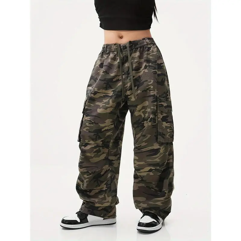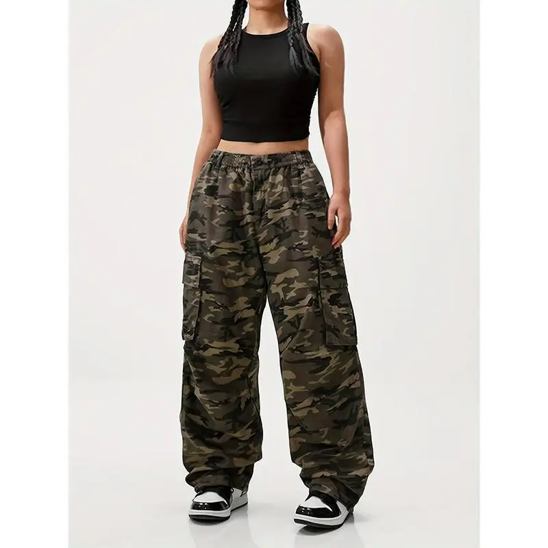 Plus Size Camo Cargo Pants - Women's Casual Woven Fabric with Flap Pockets, Non-Stretch, Machine Washable, Plus Size Design