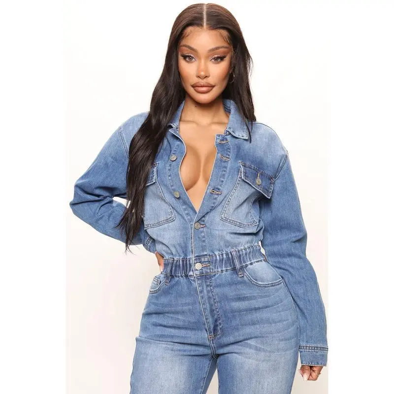 Women's Denim Jumpsuit with Long Sleeves and Button - Front Design, High - Waisted and Fitted Leg Style