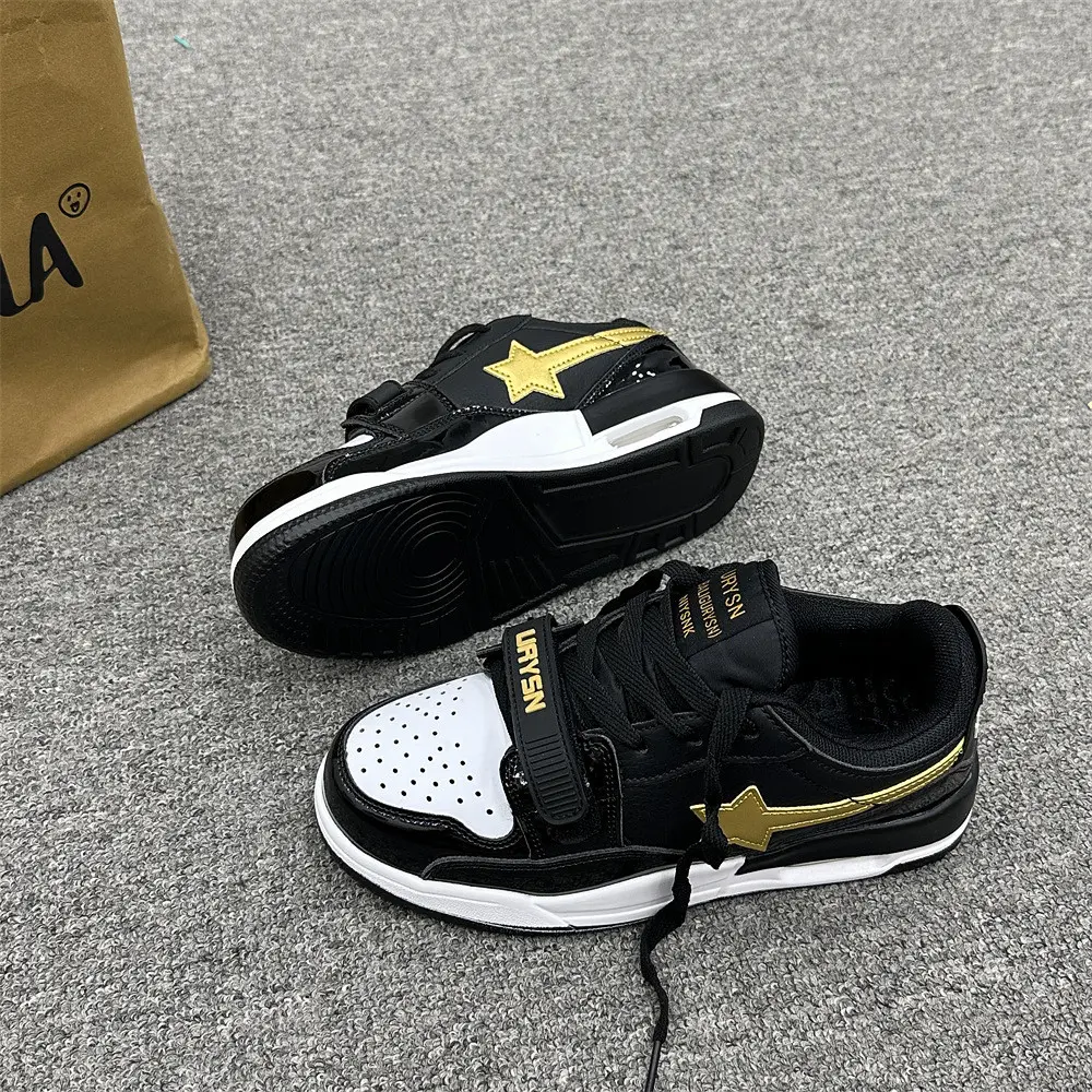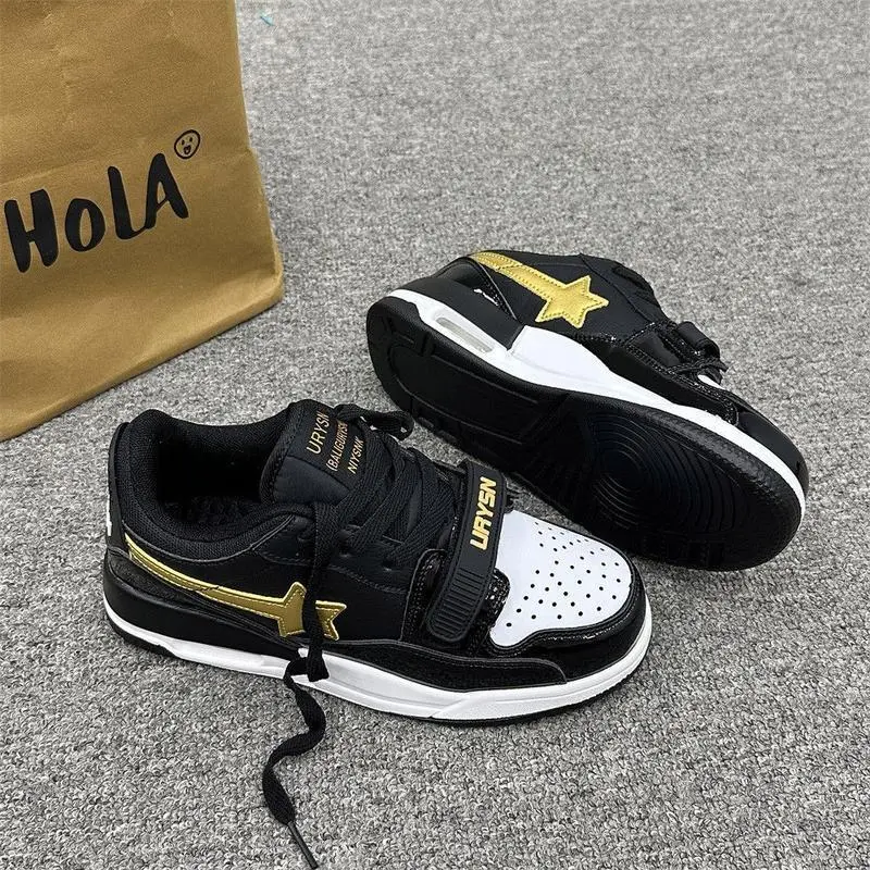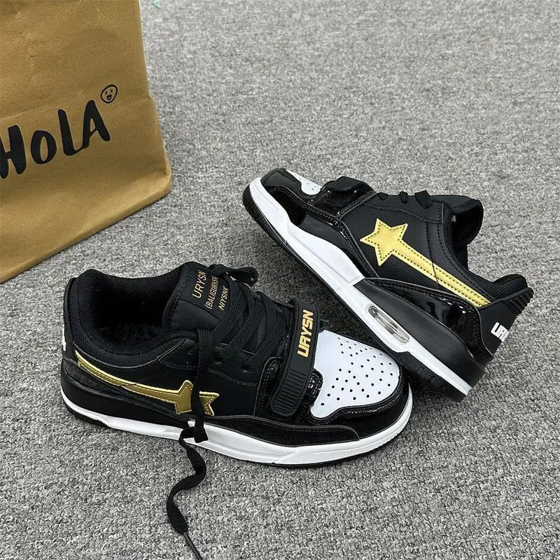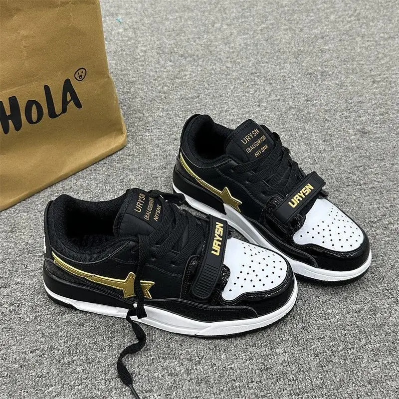 BlackandGoldColorBlockStarSneakersThickSoleCasualSportsShoesforStudentsandCouples Closed Boy